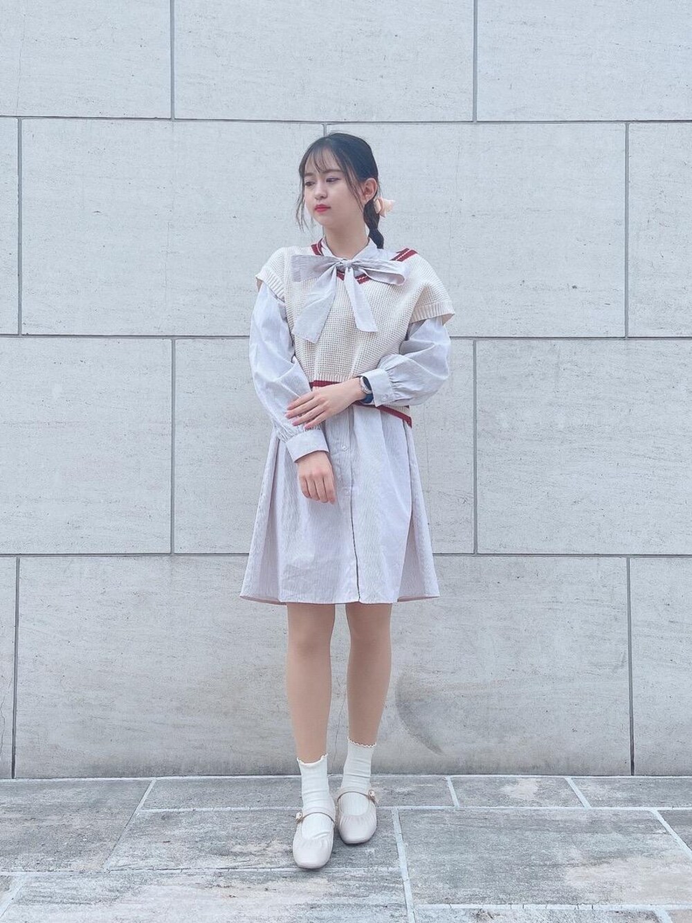 155cm mサイズ着用🌟 春に着れるシンプルなシャツワンピに大きめのベストを合わせて上品かつカジュアルなコーデになります🐶✨