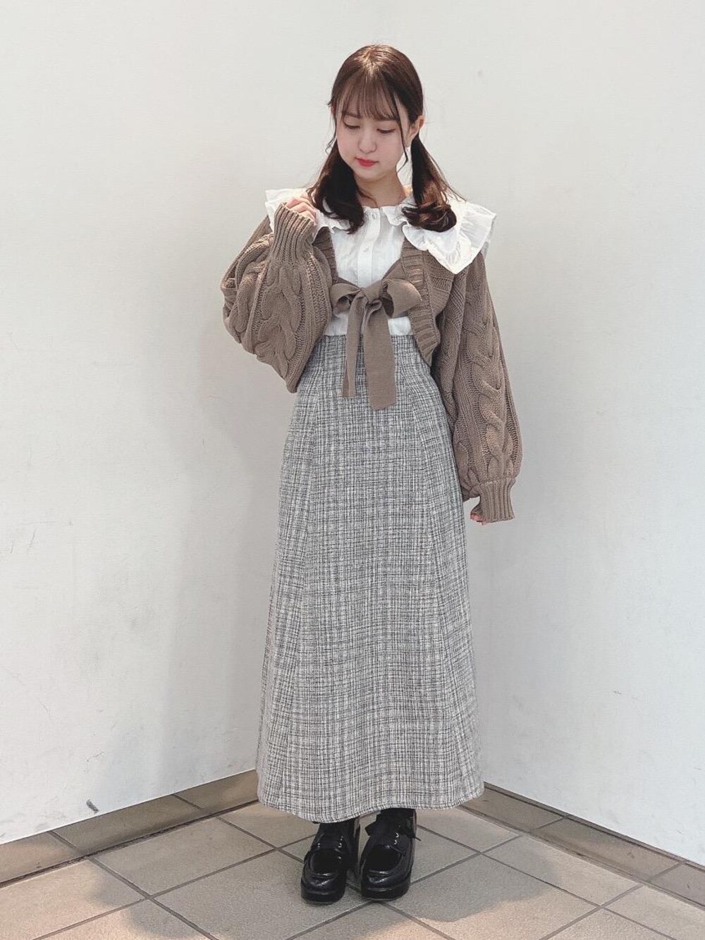 ガーリーだけれど、ロングスカートやブラウンを取り入れて大人っぽいスタイルにしました🥺🤍
