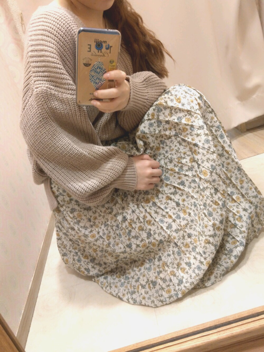少々早いですが、春物です。 ピンクベージュと花柄プリーツスカートで女の子らしさを意識しました😊