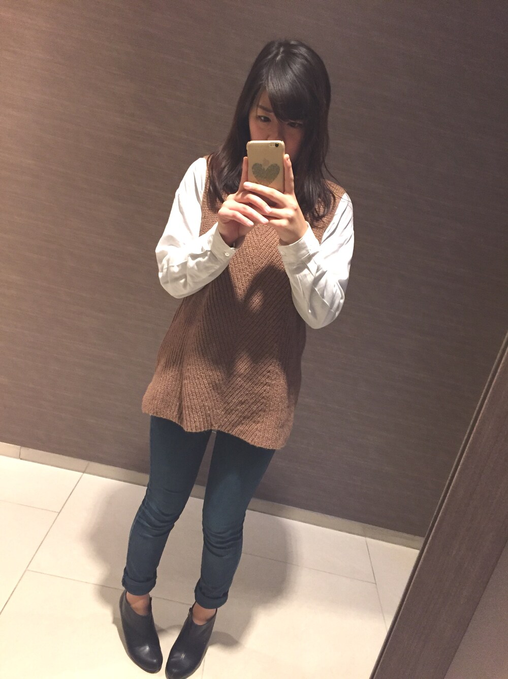 ブラウン系のベストを着用したレディースの冬コーディネートの1枚目の写真