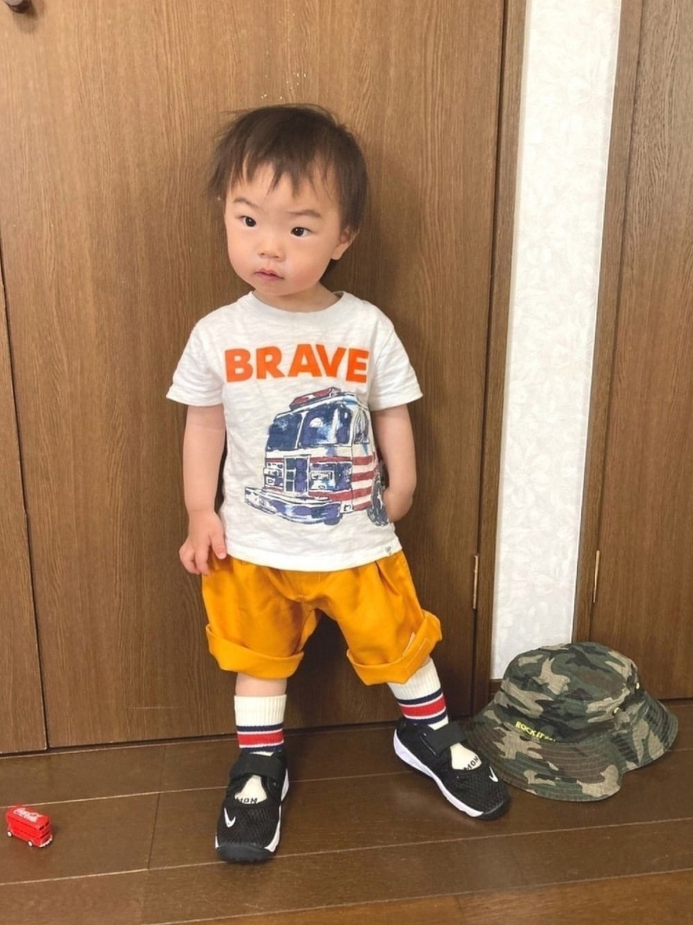 ご覧いただきありがとうございます😊 #エアリフト まずはラインソックス合わせで🤲 今日はSaturdayですが、Mon.ロゴチラリ👀 久しぶりのノー帽子で💡 エアリフト届いたので、早速履いてみた❣️ 欲張って1サイズあげたらやっぱり大きかったけど、息子お気に入り❤️ 撮影終わっても脱ぐの嫌がり新品なのでしばらく履かせてました🙈 このハーパンもおニュー←死語かw セールで429円‼️ 水遊びにも使える素材でこれからガンガン使えそう💡 後ろのポケットがカモフラ柄🦆なので、カモフラのバケハ合わせに💡 と思ったら被ってくれない🤣 小窓のお座りポーズで🤲👀 いつも+、♡、コメント、📁in ありがとうございます❣️ どれもとっても嬉しいです😃