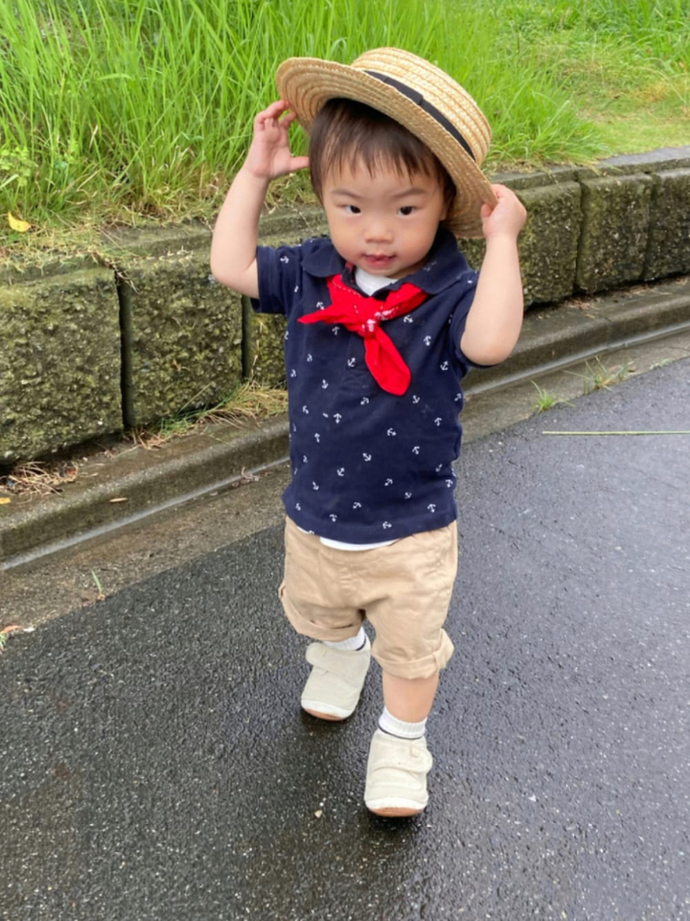 ご覧頂きありがとうございますᵕ̈* 🏷#サングラス 昨日トライするも嫌がって撮れず💦 #ポロシャツ #マリンコーデ で今日も西松屋、UNIQLO、 birthdayにDAISOのバンダナと オールプチプラコーデ😆 父の日のプレゼントを渡しに大分前に じじばばのお家に行った時の写真📸 もう撮り溜め尽きたぁー🤣 ポロシャツは友人からのお下がりの頂き物でやっと着られました✨ ⚓マークの総柄なので、赤バンダナ巻いてマリンスタイルに🐬 巻き方雑💦 小雨☔だったので足元👟で。 じぃじ初公開🙈 150cmもない小人じぃじです😲 リンクした訳でなく普段着ですが💦 息子、昨日は元気に登園し 私も久しぶり仕事行けました💡 やはり園でRS、アデノウイルスが流行っている様。 皆様もご自愛くださいませ🍀☺️✨ いつも♡、+、💬、📁in ありがとうございます✨ どれもとっても嬉しいですÜ。:*