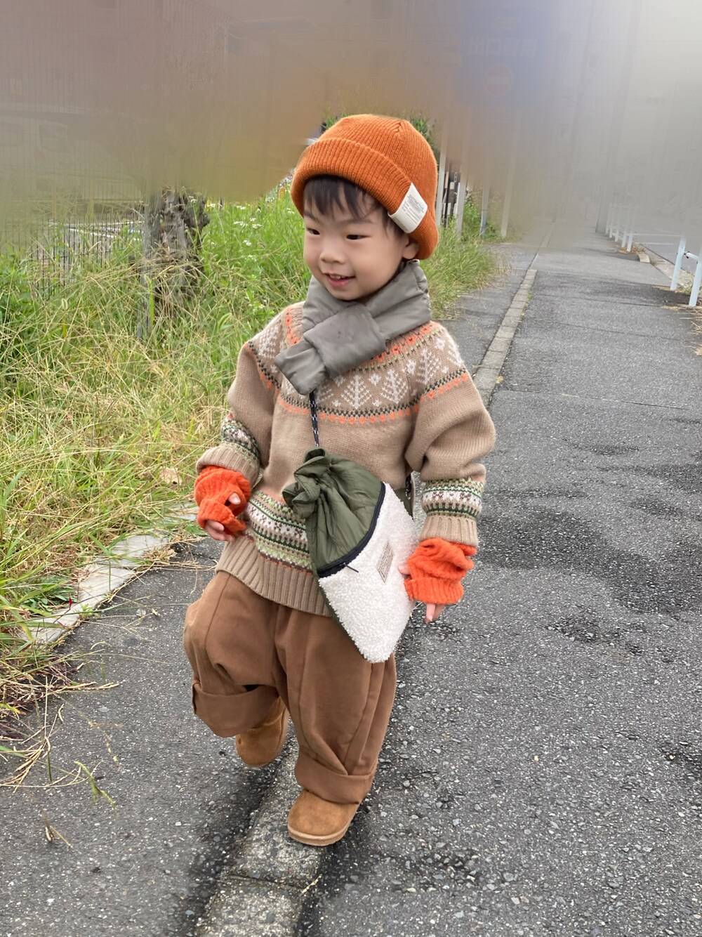 ご覧いただきありがとうございます☺︎☺︎ ▪️BEAMS mini ノルディックニットプルオーバー の着回しコーデ🧡 ベージュだからどんな色にも合わせやすい💡 土曜日のリアルコーデ🥰 昨日投稿の私と撮影し合い、私のしてたアームウォーマーをしたいと奪われました😆 ノルディック柄のオレンジ🍊とリンクしてポイントになりちょうど良かった🙆♀️ キルティングジャケット持参してたけど、ニット暖かくてアウターなしで 日中は大丈夫でした🥰 ▷▶︎▷lenlen 3y1m 91cm 11.7kg (*11/16測定)