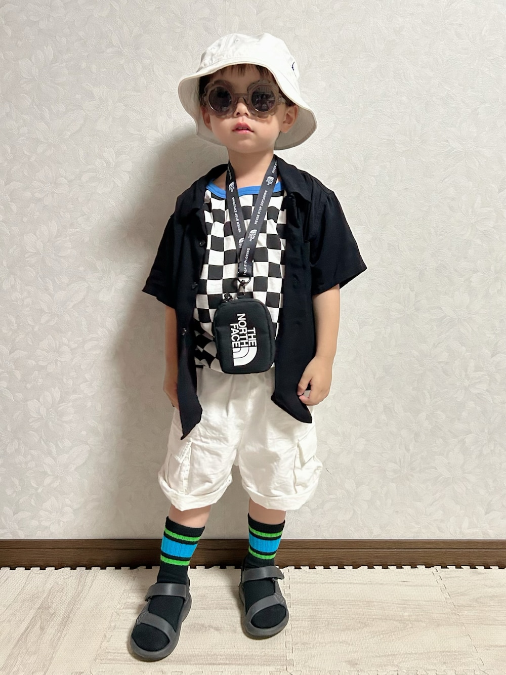 ご覧いただきありがとうございます◡̈⋆ 昨日スーパー行っただけのコーデ😆 サングラス🕶したらやけにテンション高かった🕺😎 小窓参照🪟 2枚目:手を振ってる👋けど隣には誰もいません😂 3枚目:私個人的にお気に入り写真💝 西松屋の🏁タンクトップを前に買っててやっと着れた😆 タンクからコーデ組みました💡 お気づきの方もいるかもしれませんが、チェッカーフラッグ柄🏁好きです🙈💕 今月もありがとうございました🥰✨ ▷▶︎▷lenlen boy 3y9m 95.5cm 13.7kg (*6/23測定)