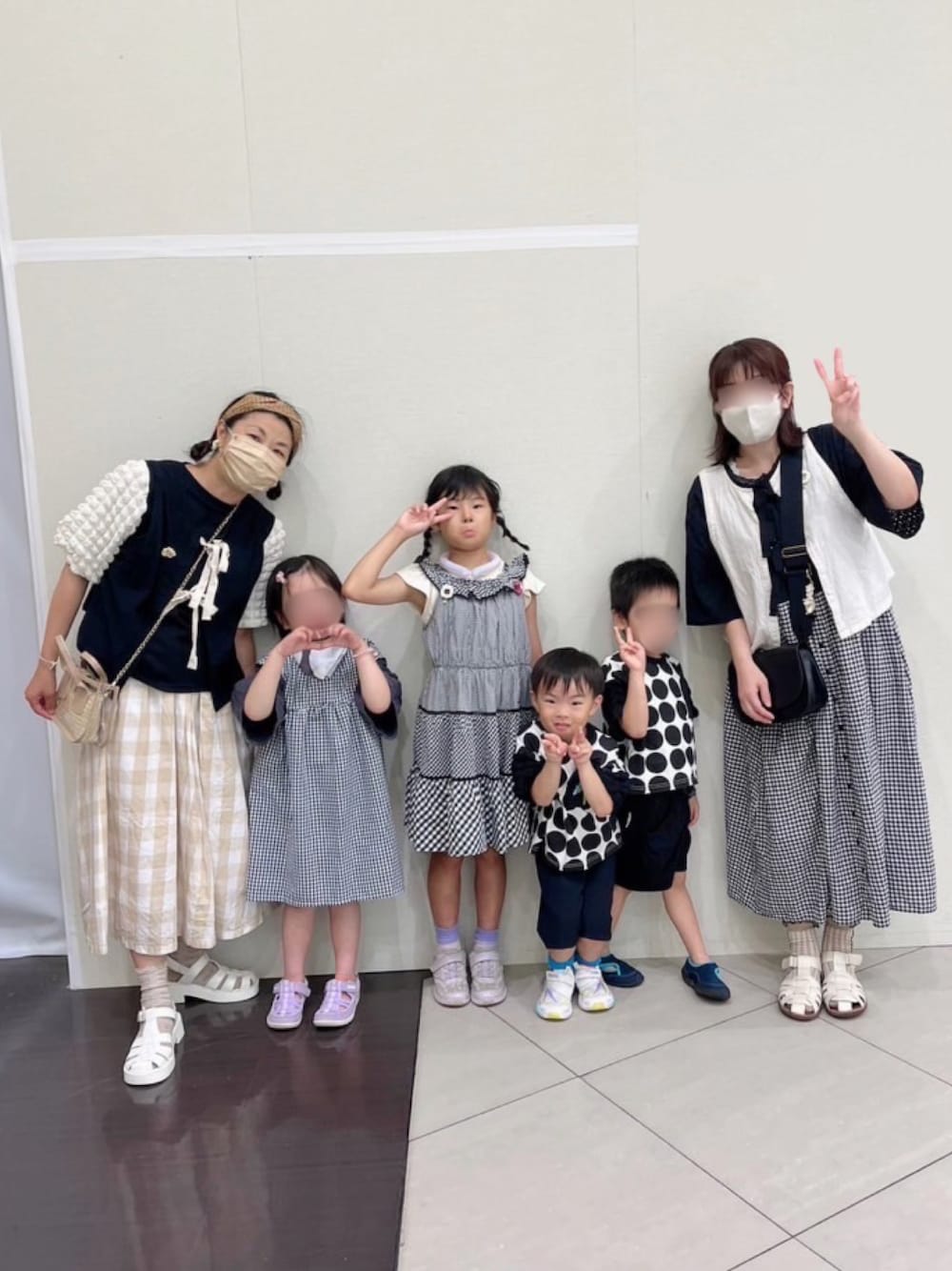 ご覧いただきありがとうございます◡̈⋆ 合成じゃないよpart2💡 親子でリアルコラボ😍 先週末にさりちゃんファミリーと会ったよ💖 さりちゃんとはモスモスリンク🔗 🏷#サンダル 私はWEGOの白グルカサンダル 本当は皆サンダル予定が子供達は 瞬足を履きたがりスニーカーに👟 結果、👧🏻は娘ちゃんとパーポーリンク💜 👦🏻は息子くんとブルーリンクに💙 私がさりちゃんと会うのは2回目❣️ 昨年GW以来💡 相変わらず可愛かった💓 お子さん達&パパさんはお初でした🥰 大窓、2枚目の写真はさりちゃんの旦那さん撮影📸✨️ 会って早々にお願いしても快く撮影してくれ、私が図々しく座って欲しいとか縦でもとか色々注文つけても嫌がらずに撮影してくれ優しいパパさん🥹✨️ 本当にありがとうございました🙇♀️✨️ ✿母👩🏿🦰コーデ✿ モスモスのオソロベストとモスモスのベージュチェックスカート さりちゃん作のチューリップ🌷イヤリング とブローチ、前に会った時に頂いたお花🧦 合わせ💓 髪型はW三つ編み団子🍡 yu.(@yurikukoko)さんことゆりちゃんの8/2投稿の髪型真似っこ🥺💕 前にきぬちゃんもしてて可愛かった🥰 似合ってるかは別として涼しいし気に入ったよ💖 ゆりちゃんありがとう💓 🏁リンリン👧🏻🏁 さりちゃんのアナベルさんブローチ 娘ちゃんとギンガムチェックワンピリンクに🥰 さりちゃんの娘ちゃん最初人見知りしてた けどすぐ打ち解け、たくさんお話してくれた❣️ 🖤レンレン👦🏻🖤 息子くんと👧🏻👦🏻で2022年に節分コラボしていて今回はBirthdayのmaninaのトップスがオソロでリアルコラボが実現🤩 さりちゃんにオーダーメイドで作ってもらったスピノサウルスブローチ🦕←これはブラキオサウルス😆 と💙🧦合わせ💡 2人とも黒ハーパン履いてて、裸足で遊んでいた時、後ろ姿だと一瞬どちらか分からなくなる位似てた🤭💕 本当は前回のジルちゃんの野外コンサート に一緒に行くはずが来られなかったので、 その時渡す予定だった物を渡したいのも あり無事会えて本当に嬉しかったし 楽しかったぁ💖 さりちゃんとはトールコロンで156cm仲間だし、同じ姉弟の2児の母とか他にも沢山共通点があり親近感🤩 子供達たくさん遊んで本当に楽しんでたし、 私もさりちゃんと色々お話できてあっという間の充実した時間だった🥺💓 最後に娘ちゃんがハグしてくれ感動🥺💕 なんて可愛いの🥰 小窓に様子と頂いた可愛いオシャレなお菓子と🧸さん達❣️ お菓子美味しかったし🧸さん2人とも気に入ってるよ🥺❤️ さりちゃんファミリー本当にありがとう☺️💕 また会おうね❣️ コラボも楽しみにしてるね❤️ 今日から👦🏻の保育園通常保育になり、 仕事休みでも預けられ、バス🚌登園も再開💡 少し💬欄開けます🙋♀️ 返信は遅くなるかもしれません🙇♂️