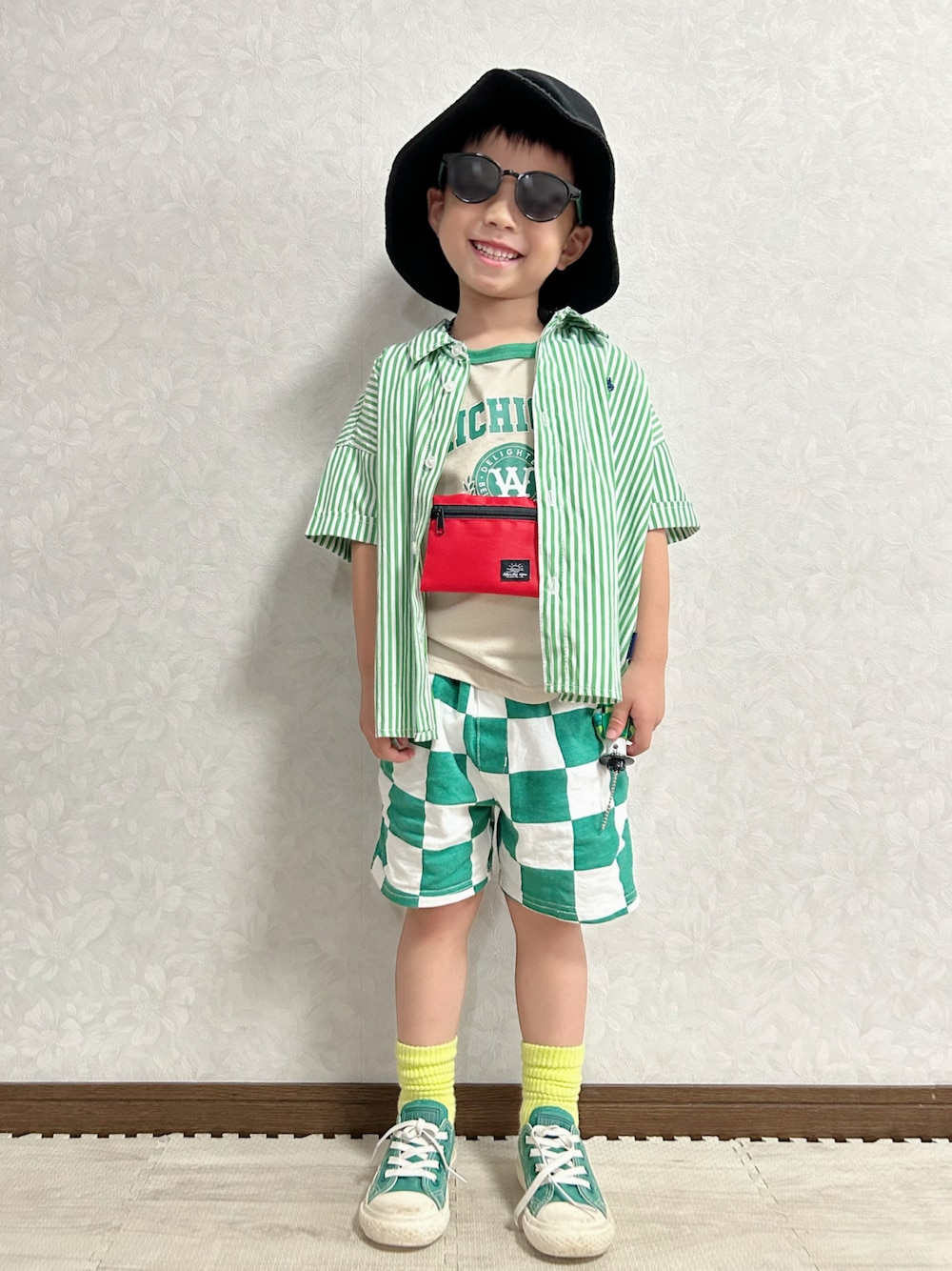 🏷#サングラス🕶←偶然今日ピックアップ💡 昨日のまーくん追いコーデに ストライプシャツ羽織り小物変えました🤗 ❀大窓5枚あり ❀小窓🪟 お手本コーデのナガネギマン🎩💚 レンレンがグリーンコーデが ナガネギマンみたいと言い出し、 ガチャガチャを持参😆 小物を変えてナガネギマン仕様に💚 ストライプでもチェックでもないので あくまでもイメージ😆 Nマークが赤だったので、財布で アクセントに❤️ バケットハットとサングラス😎で ナガネギマンチックに😆 レンレン喜んでました🤣 𝕋𝕙𝕒𝕟𝕜 𝕪𝕠𝕦 ❤︎" ▷▶︎▷lenlen 4y10m 101.9cm 14.9kg (*7/19測定)