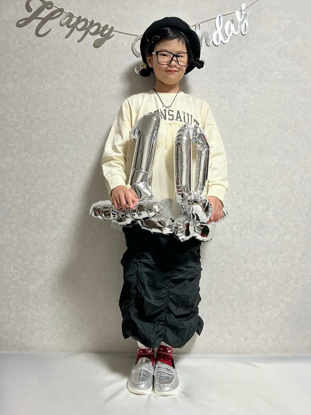 本日、レンレンの姉のリンリン10歳 になりました🎂✨️ 大好きなモノトーンにミニーちゃん🎀🧦❤️ CIAOPANIC TYPYさんのスカート、 yuto@airiさんがセールの情報を 投稿をしていてお安くGET💡ありがとう🥰 ついでにトップスも購入💡 レギンス、🧦セットはかわいいなと思っていて 併せてZOZOで注文して、一式私からの誕生日プレゼントに🎁 かわいい❣️と気に入ってレギンスも穿いてくれました🥰(見えてない💦) 分かりずらいけど本人希望でアイブロウ、 チーク、アイシャドウ、💄、リップグロスも 塗ってお化粧してます😆 けど本格的に化粧するのは5年生からが良いみたい😆 髪型は三つ編みお下げだったのがリンリンが これにしてとリクエスト💡 ゴムはゆうたんママから私のBD💝にいただいた白と黒アシメに🖤🤍白しか見えず🙇♂️💦 Cちゃんからもらったヘアピンアクセントに💡 10のバルーン🎈スタンド用だった😅 *大窓5枚あり 3枚目:後ろ姿 🧦チェンジ *右🎄点灯💡 4枚目:フォトスタジオにて撮影📸👧🏻👦🏻 5枚目:ハーフ成人式記念に20歳の時の夢を 書きました💡 ・好きなお菓子爆買い😆 ・デザイナー、パティシエ なんとドレスデザイナー👗は7歳(小1)の時 から4年連続変わらず💡 運動、身体を動かすことが大好きな活発な娘ですが、絵を描くのも好きです☺️ 最近は反抗期と自分でも言っていて 難しいお年頃です💦 が根は優しくて私よりしっかりして頼りに なる娘です😆 昨日はお友達らが体操🤸♀️レッスン後に 誕生日のお祝いに家族で行く予定だった ステーキハウス🥩に付いてきてくれ、 私たち夫婦に子供が7人の大所帯で 楽しかったです🎶 友達にも恵まれ元気に楽しく過ごしてるのが 何よりです✨️ 今日もリンリンの希望でまた友達らとトランポリンしに行って来ます😆 リンリンが動画を撮りたいと言ってくれ撮影しましたが、バタバタで編集追いつかずまた後日投稿します😂 いつもご覧いただきリアクションありがとうございます☺️✨️ たまにひょっこり現われると思いますので、 10歳のリンリンもよろしくお願いします🤲 𝕋𝕙𝕒𝕟𝕜 𝕪𝕠𝕦 ❤︎" ▶︎▷▶︎rinrin 10y0m 133.7cm(*9月測定)