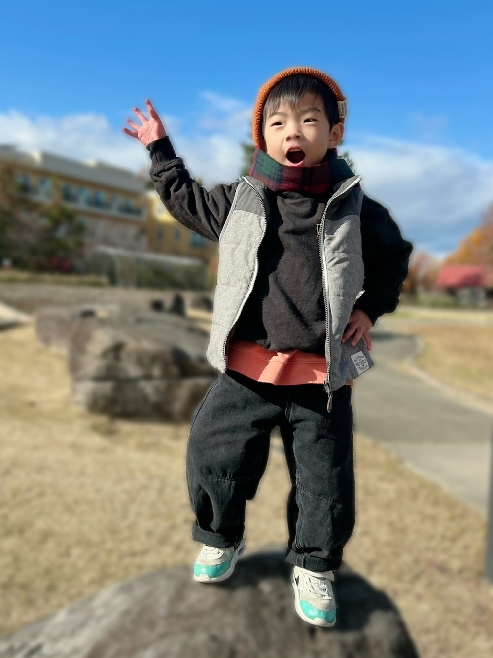 BBQサイトにて🥩🔥 親子、縄跳びの写真はお友達の一眼レフにて📸アウター中綿ジャケットver.💚👦🏻初ホッピング🐇 右上:👧🏻👦🏻落ち葉合戦🍂 左下:縄跳び練習中👦🏻 右下:🔫 シャボン玉🫧お尻🍑😆