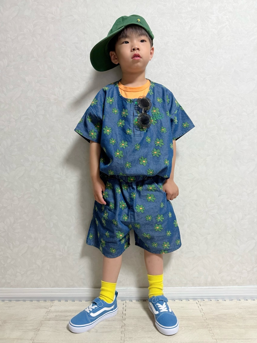 アカチャンホンポにて発売中の、 PCHY(ピーチイ)× まほちゃん ma-kun @miiiii2uki さんとのコラボ第二弾💡 たくさんあるラインナップの中からまず レンレンがこちらの抜染デニムTとショートパンツのセットアップを選んだよ💙🌼 120cmまでの展開で近所の店舗は大きいサイズ 取り扱いなかったのでオンライン購入🛍 まほちゃん作お花が散りばめられて デザインもシルエットもとってもかわいい🤩 唯一無二でお気に入り♡ セットアップで着ればこれだけでおしゃれに🌼✨️ *大窓5枚あり 1枚目:タックイン 2枚目:裾折ってインナー見せ🧡 3枚目:横ポーズ ロゴタグ見せ🏷 4枚目:斜め後ろポーズ 5枚目:UP👀🔎胸刺繍、スナップボタン見せ🧵🪡🔘 細部までこだわって作られてて、 胸にはブランドロゴ Much Ripen の刺繍が🤩 左サイドにブランドタグ💡 スナップボタン付きでお着替えしやすいし、 インナー見せも出来ちゃう❣️ パンツは後ろの大きなポケット右横にブランド ロゴタグ付き💚 他にもう1枚購入❣️ 𝕋𝕙𝕒𝕟𝕜 𝕪𝕠𝕦 ❤︎" ▷▶︎▷lenlen 5y8m 107.4cm 17.0kg (*5/21測定)