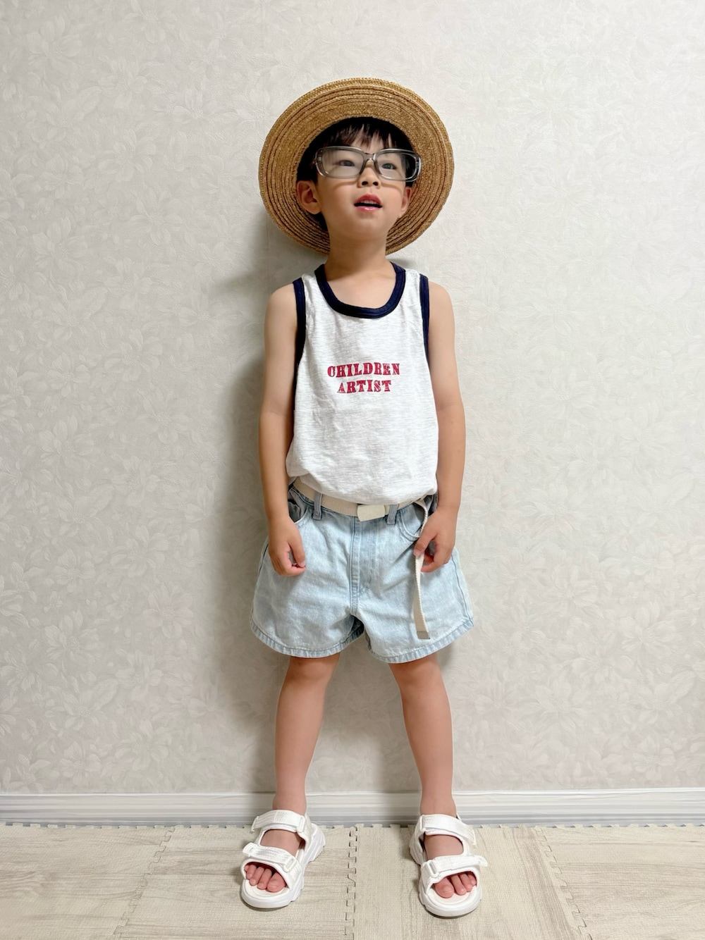 韓国子供服セレクトショップ PINAさんでかわいいロゴタンクトップも購入💡 レイヤードにも1枚でも使えてこの夏大活躍🎶 真夏こんなシンプルなコーデ多そう☀️ バランス考えてタックイン、ガチャベルトでアクセントに💡 6/22投稿コーデのデニムシャツ、 🐝タンクトップ脱いでカンカン帽👒被り😆 *大窓5枚あり 4枚目:お腹が顔に😆サングラス🕶の位置😅 5枚目:タンクトップ普通に着たver. 🕶は🩳のポケットに💡👦🏻案 𝕋𝕙𝕒𝕟𝕜 𝕪𝕠𝕦 ❤︎" ▷▶︎▷lenlen 5y9m 108.6cm 16.5kg (*6/16測定)