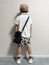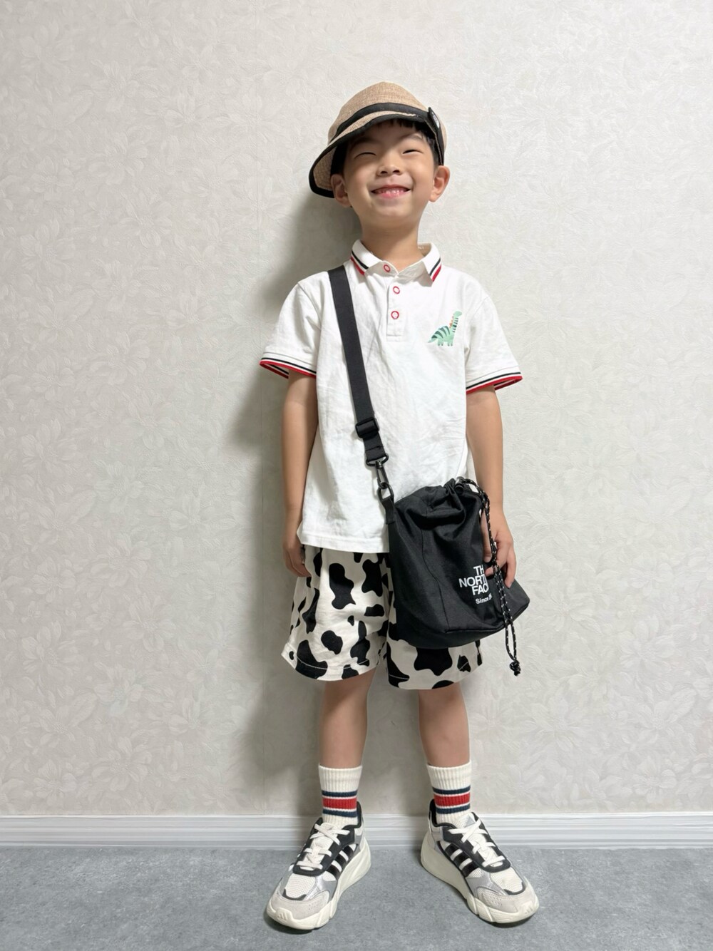 昨日のリアルコーデ😆 モノトーンに牛柄🐄、🦖ワンポイント、 襟と合わせたラインソックス🧦でアクセントに💡 遊び心のある柄や小物で、子供らしさとかっこよさを💡 *大窓4枚あり #トリックアートフェス着回しコーデ ポロシャツに🏁⇒🐄柄に変更💡 よりアウトドア感🏕🐮 𝕋𝕙𝕒𝕟𝕜 𝕪𝕠𝕦 ❤︎" ▷▶︎▷lenlen 5y11m 109.3cm 16.5kg (*7/14測定)