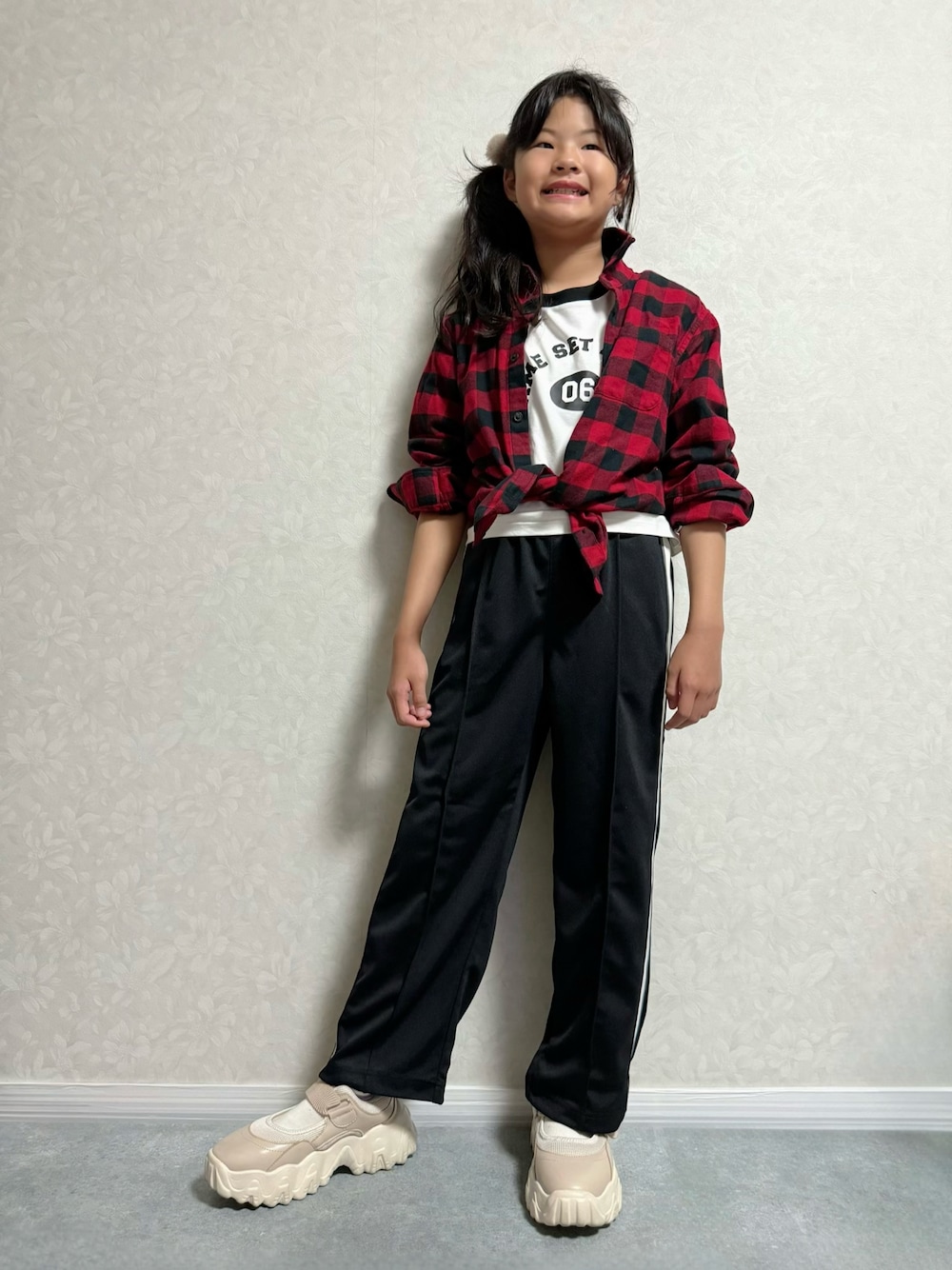UNIQLO × GU 新作コーデ💡 *大窓2枚あり モノトーンに赤のフランネルチェックシャツ 前結びでウエストの位置が高く見え、スタイルアップ効果💡 トラックパンツはフロントタックあり、足スッキリ見え👀✨ #pr 𝕋𝕙𝕒𝕟𝕜 𝕪𝕠𝕦 ❤︎" ▶︎▷▶︎rinrin 10y9m 140cm(*7月測定)