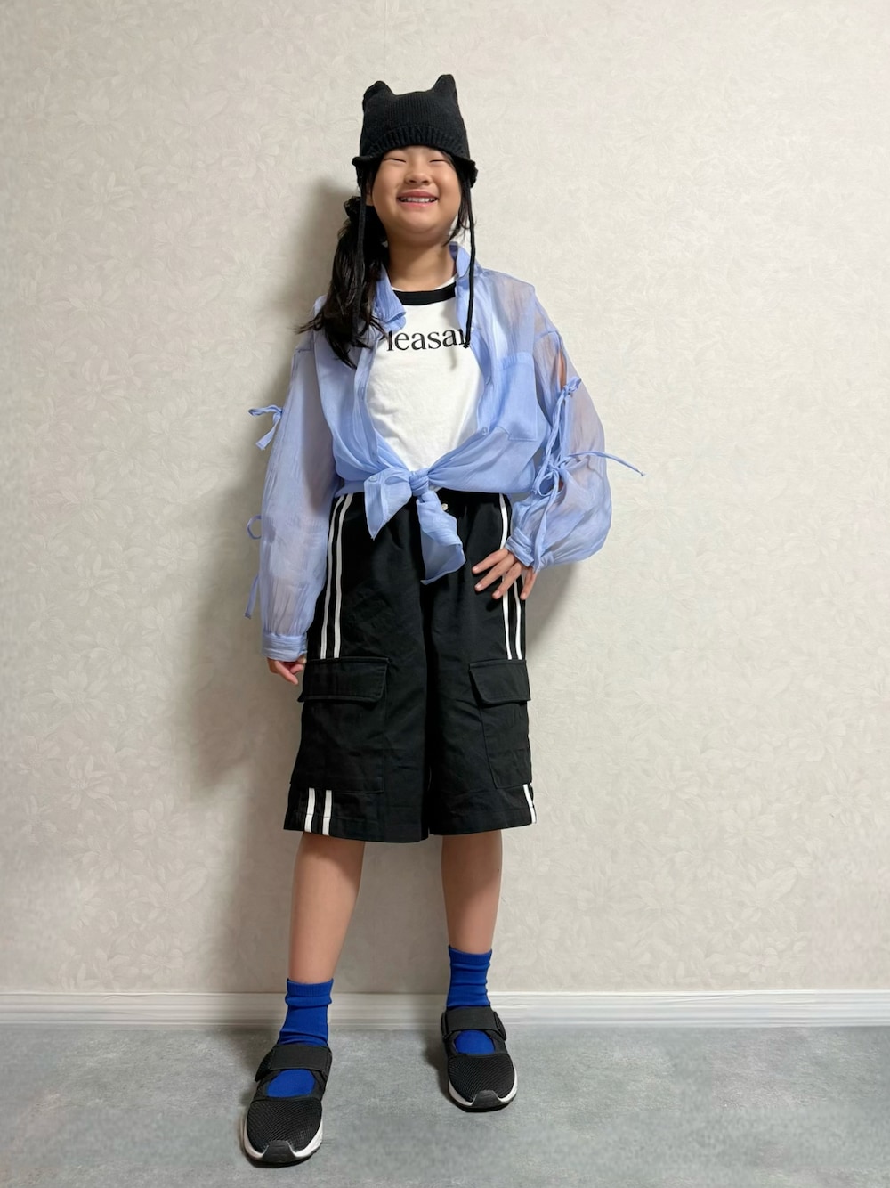初BISKEE❣️ 夏にも着ててパンツは学校にもよく穿いてるけど、初お披露目🙈 スポーティーなラインバミューダショーツ にシアー素材やハロウィンを意識して 猫耳ニット帽🐈⬛で甘辛MIX💡 ネコ耳ニット帽👧🏻も被れた😆 ただ撮影後に前後ろ逆に被っていた事が判明😝💦 シアーシャツの袖の🎀可愛い❣️ 母と共用💡冷房対策にも良き✨️ 𝕋𝕙𝕒𝕟𝕜 𝕪𝕠𝕦 ❤︎" ▶︎▷▶︎rinrin 10y10m 141cm(*9月測定)
