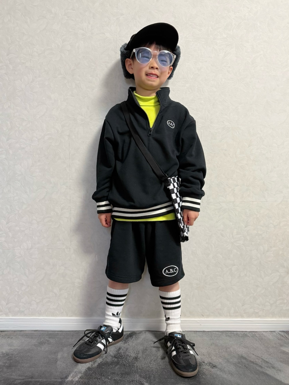 色と小物で魅せる、こだわりストリートカジュアル🖤🍋🟩💙 pairmanonのプチプラ ハーフジップセットアップ🖤 今ならなんと1,100円😳‼️ 袖と裾のボーダーリブ、胸元、パンツの裾の刺繍ロゴがアクセントになりかわいい🫶 裏起毛ではない普通の裏毛のスウェット 生地なので着心地も良く程良く暖かい🖤 インナーは差し色で🍋🟩をプラス。 足元はsamba+靴下でadidasリンク🧦👟 サングラスは レンレンこだわりポイント💡 👟と合わせたそう💙 アウターがグリーンなので、 カラーをリンクさせてみました💚 セットアップは👦🏻👧🏻イロチで購入🖤🩶 *5枚あり 𝕋𝕙𝕒𝕟𝕜 𝕪𝕠𝕦 ❤︎" ▷▶︎▷lenlen 6y3m 111.9cm 17.9kg (*1/15測定) 身長1.2cm UP💡