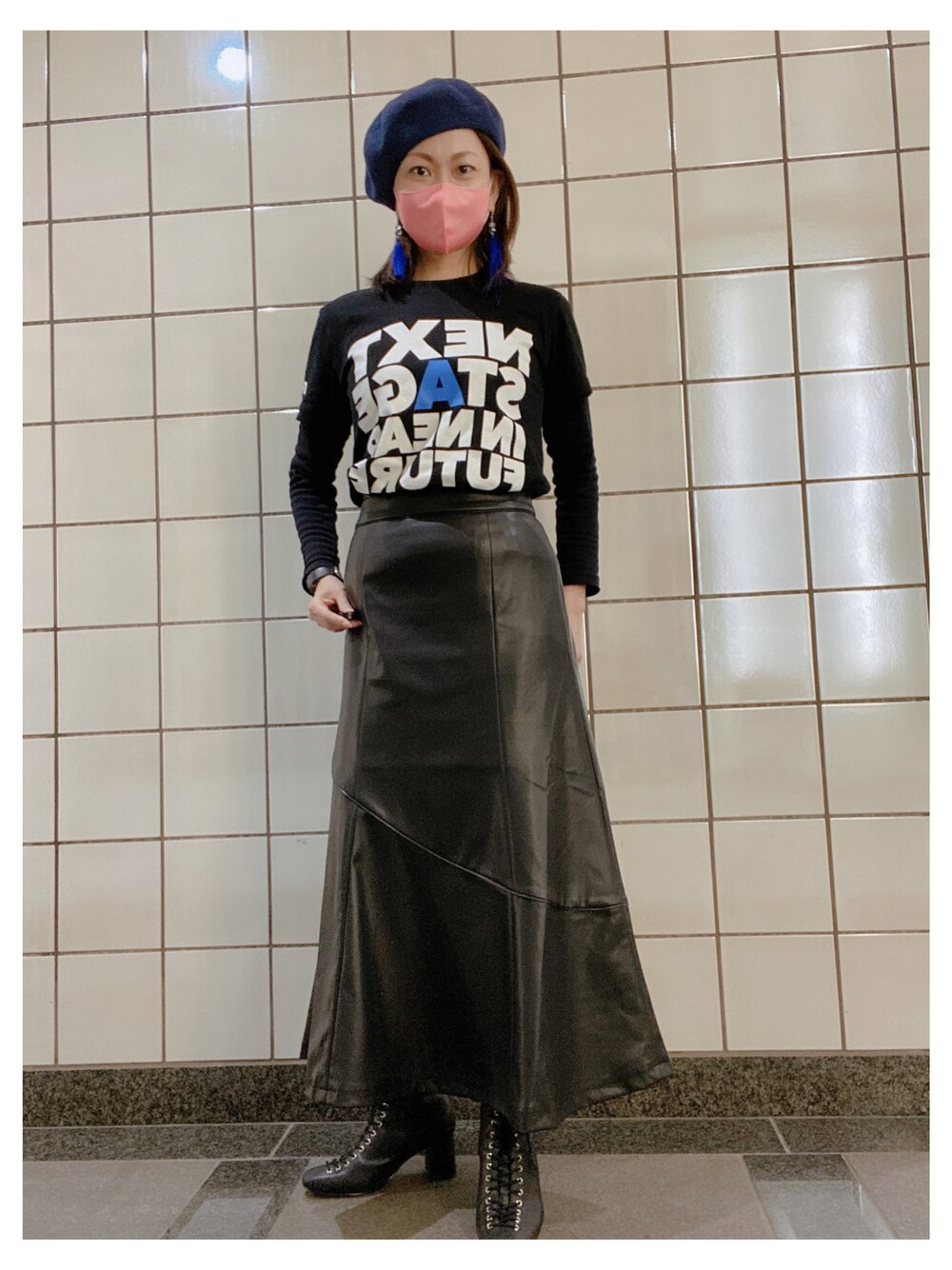 トオルとヒロシ(矢野通選手と棚橋弘至選手のタッグ)を観に後楽園ホールへ キメポーズのヤンキー座りを真似てみた😂 本日のスカートはフェイクレザーマーメイドスカート WEARでコーデ写真をたくさん拝見してとてもカタチが綺麗だったので購入✨ 黒のNEXT STAGE 棚橋Tシャツにレザーのライダースを合わせていた棚橋さんがめちゃめちゃかっこよかったので真似しました☺️ 本日のピアスは中華タッセルピアス 棚橋Tシャツのロゴの青に色を合わせました💙 棚橋コーデ 27コーデ