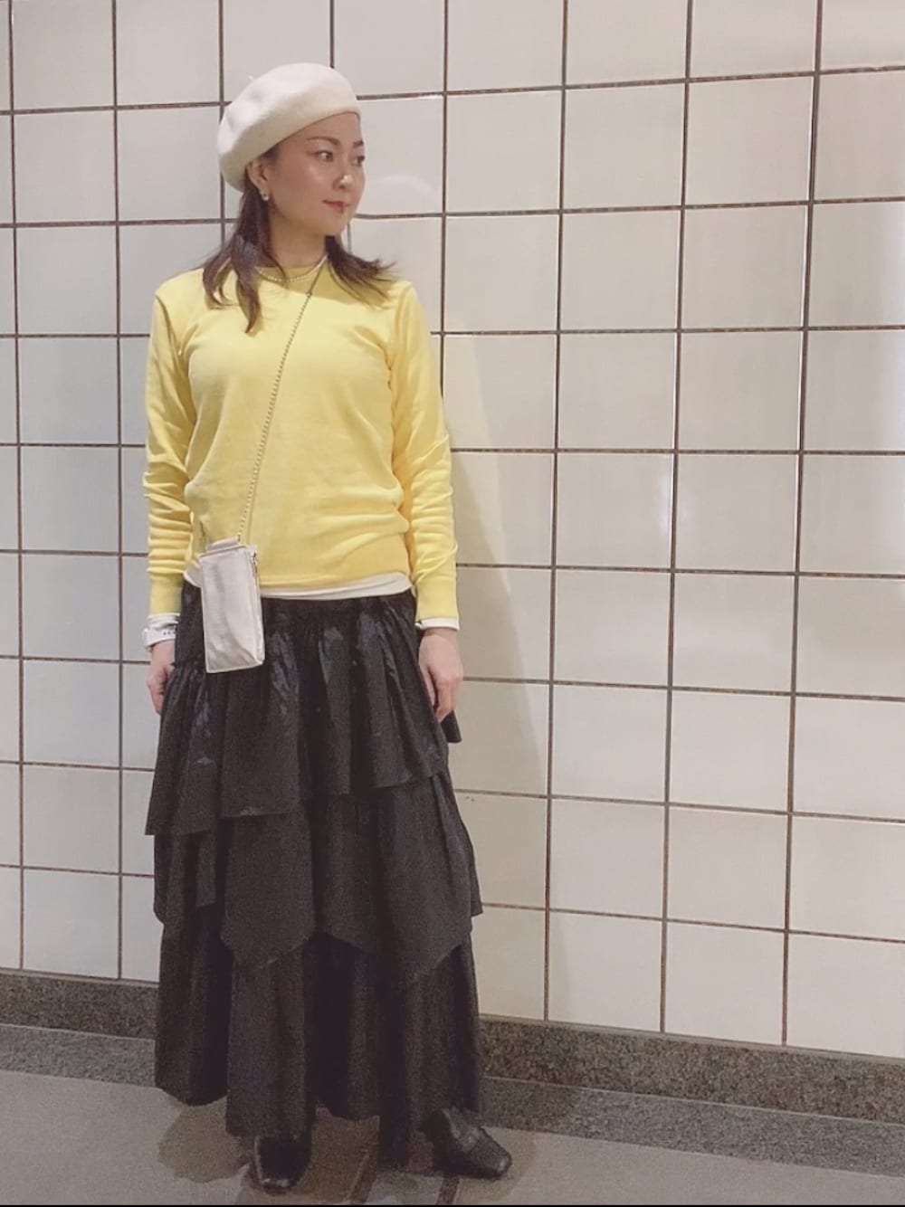 イエローニット×フリルスカート×ベレー帽 MACOさんの「制限♡解除」の出版記念セミナーに参加するため角川書店のイベントホールへ行ってきました。 MACOさんの熱気溢れるセミナーで参加者の方も熱心に聞いていらっしゃいました。とても楽しかったです…!「もうがんばれない」と諦める、がんばらない方が上手くいく、というのが衝撃的でした!MACOさんのイベントはベレー帽をかぶることにしてます。 スマホショルダーが流行ってるので以前RANDAの購入特典でいただいたショルダーを持っていきました。 ■トップスはUNIQLOのウォッシャブルコットンクルーネックセーター 今年の春はイエローが着たい気分です💛 メンズのアイテムなので大きめなんですがSサイズにしてなるべくジャストサイズを選びました。パキッとしたイエローがとてもかわいい。インナーに超極暖のロンTを着ているのでコットンセーターでもあったかい! ■ボトムスはPAGEBOYのフリルティアードスカート 骨格ストレートで下半身太めの私でもそれほど着膨れせずに着られるフリルティアードスカート🖤 高めの位置から斜めにフリルが入ってるところとか広がり過ぎずストレートっぽいラインになってるところとか天才✨ ■ピアスはSHEINのリボンパールピアス つなぐ、とか結ぶ、とかのイメージで。