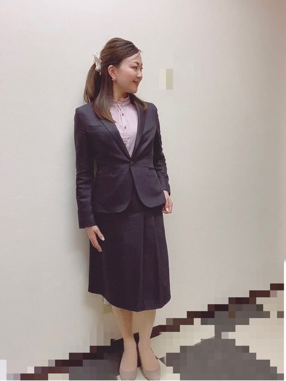 お仕事コーデ 備忘録として 桜ピアスと桜ヘアピンがポイントです🌸 ハーフアップは横を引っ詰めすぎても似合わないなと感じました…頬の丸さが目立つ…次は横も少しだけ解してみようと思います。