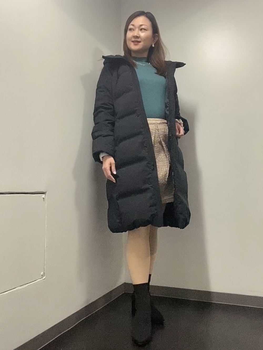 ダウンコート×ハイネックニット×ミニスカート×ファイクタイツ🖤💚👑 鉄の意志(ダイエット)中なのでミニスカート履いてモチベ上げ🔥 緑×金のカラーでホリデーシーズンっぽく🎄.* ■コートはUNIQLOのシームレスダウンコート 軽くてめちゃくちゃ温かい♨ 昨年購入したキルティングコートが首元寒い➕着膨れするので別のダウンコートをさがしてました…! ハイブリッドダウンコクーンコート狙いでお店行ったんだけど羽織ってみたらめちゃくちゃラインが綺麗で着痩せしたので急遽変更しました! 表面がマットな感じの黒ダウンが欲しかったのでドンピシャ✨ UNIQLOで1万円以上するアイテムは初めて買った…けど納得の温かさです。黒ダウンは仕事先やお店で間違えやすいのでおリボンつけたよ🎀 ■タイツはtutuannaのペールベージュのフェイクタイツ めちゃくちゃあったかい! GRLで2000円以上して躊躇してたけどこれは1500円くらいだった! 遠目に見るとストッキングっぽく見える感じ!足先まで起毛であったか!良き!