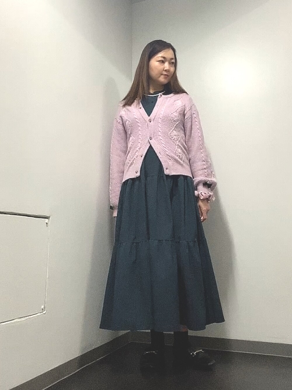 ピンク×ディープグリーン🎀🥦 カーディガンや小物をピンクで統一。大人なのでパープルっぽいピンクに。 仕事先の方がでピンクコーデに気づき褒めて下さって嬉しかった~💕 私も周りの方々の素敵ポイントに気づいて褒めよう。 カーディガンよお袖にリボンをつけてワンポイント🎀 前に襟に付けたら顔タイプ的にあんまりしっくりこなかったのでお袖にしてみました。