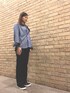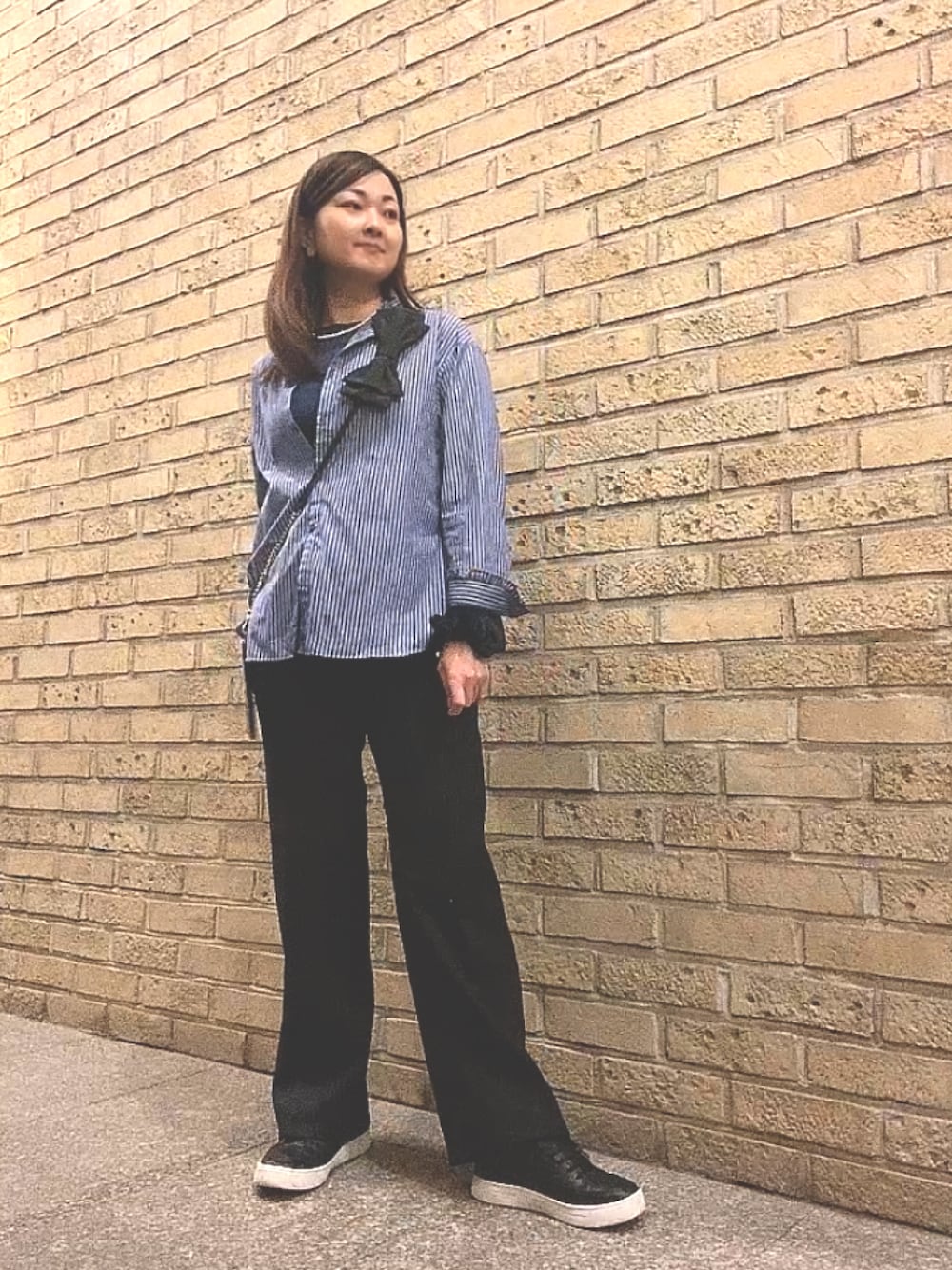 カジュアルコーデにリボンショルダーで甘さ小さじ少々🎀 カジュアルOKの動き回るお仕事💙 単なるカジュアルで終わりたくなかったのでストライプシャツにシアートップス合わせてトレンドを意識して、スマホショルダーをリボンにして甘さをプラスしました🎀