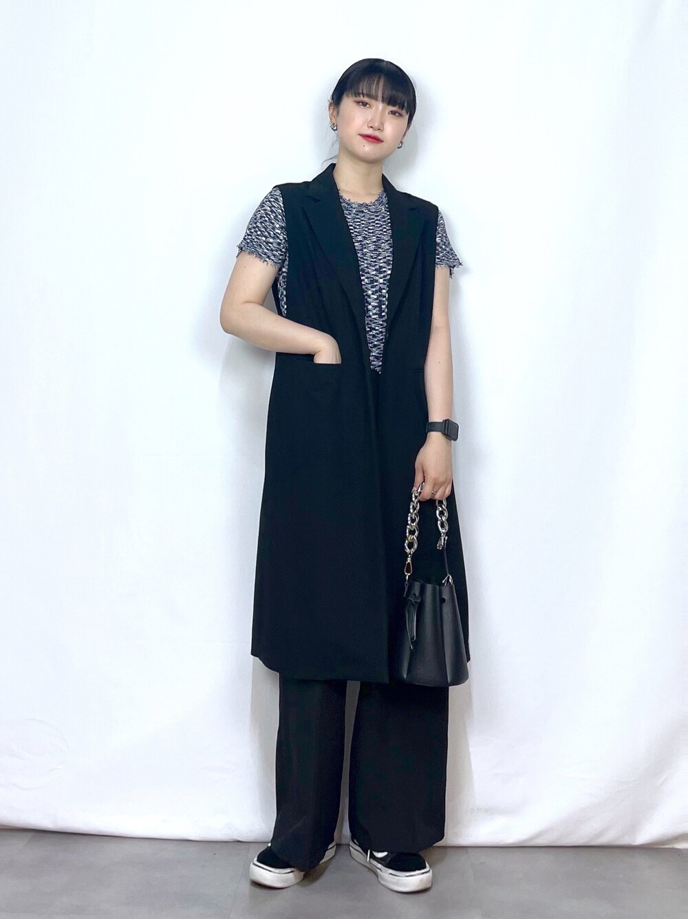 遂にロングジレ登場しました!!✨実際私もリアルバイしたのですが、通常のジレジャケットより長く気になる下半身がすっぽりと隠れるので安心感抜群です❤︎サイドが開いていて、後ろにもスリットが入っているのでロング丈ではありますがかなりスッキリして見えます☝️スカートに合わせても太めのパンツに合わせてもカッコよく決まります!!