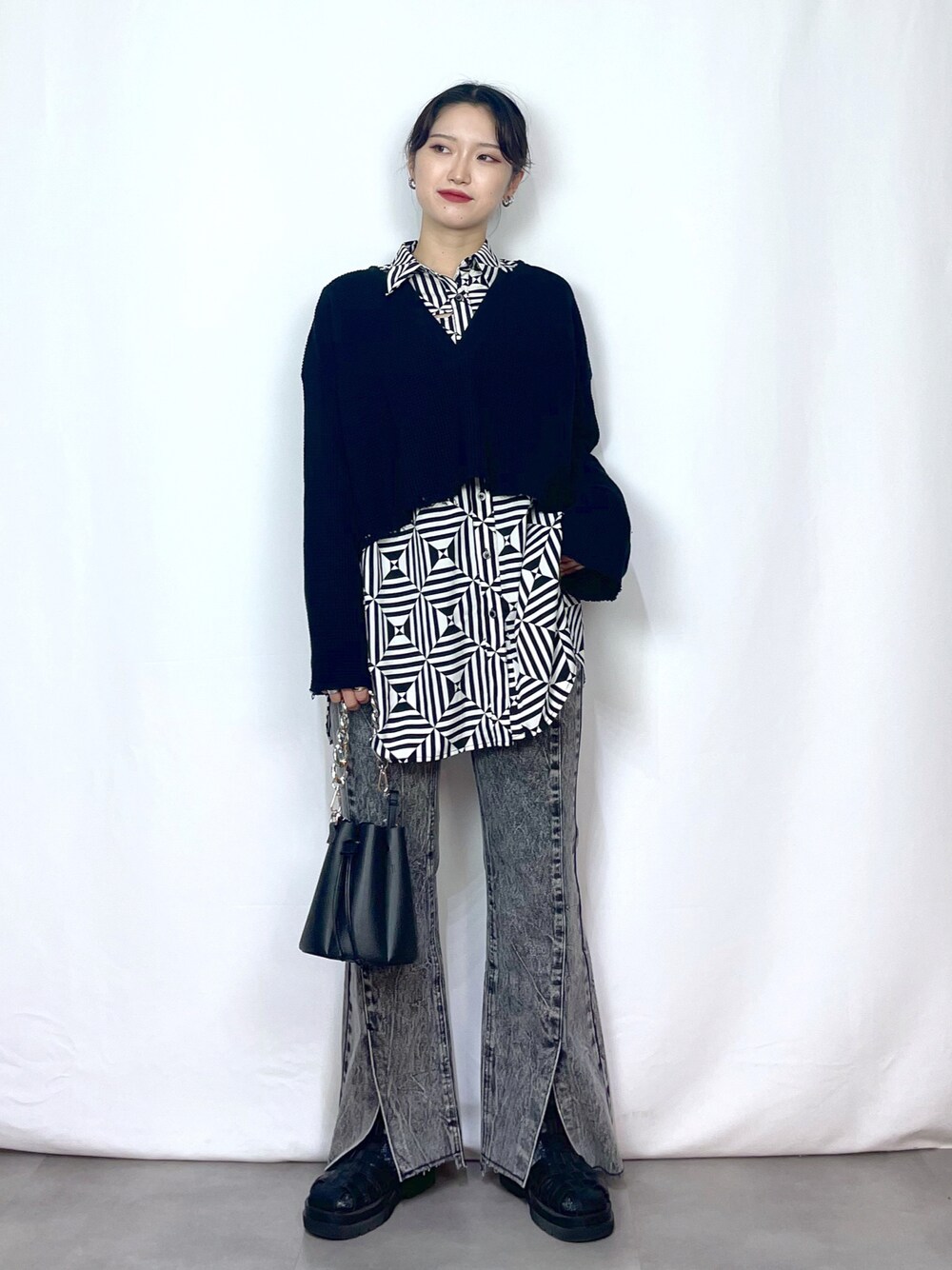 前回投稿したジオメトパターンルーズシャツとCOREのダメージワッフルトップスをレイヤードさせてコーディネートしてみました!!ボトムスは安定のフロントスリットジーンズ👖