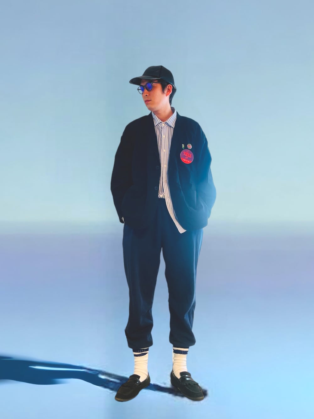ジャケット×スウェット×ローファー アシンメトリーのタックイン パンツの裾もイン ポイントで一味加えるのがお気に入り