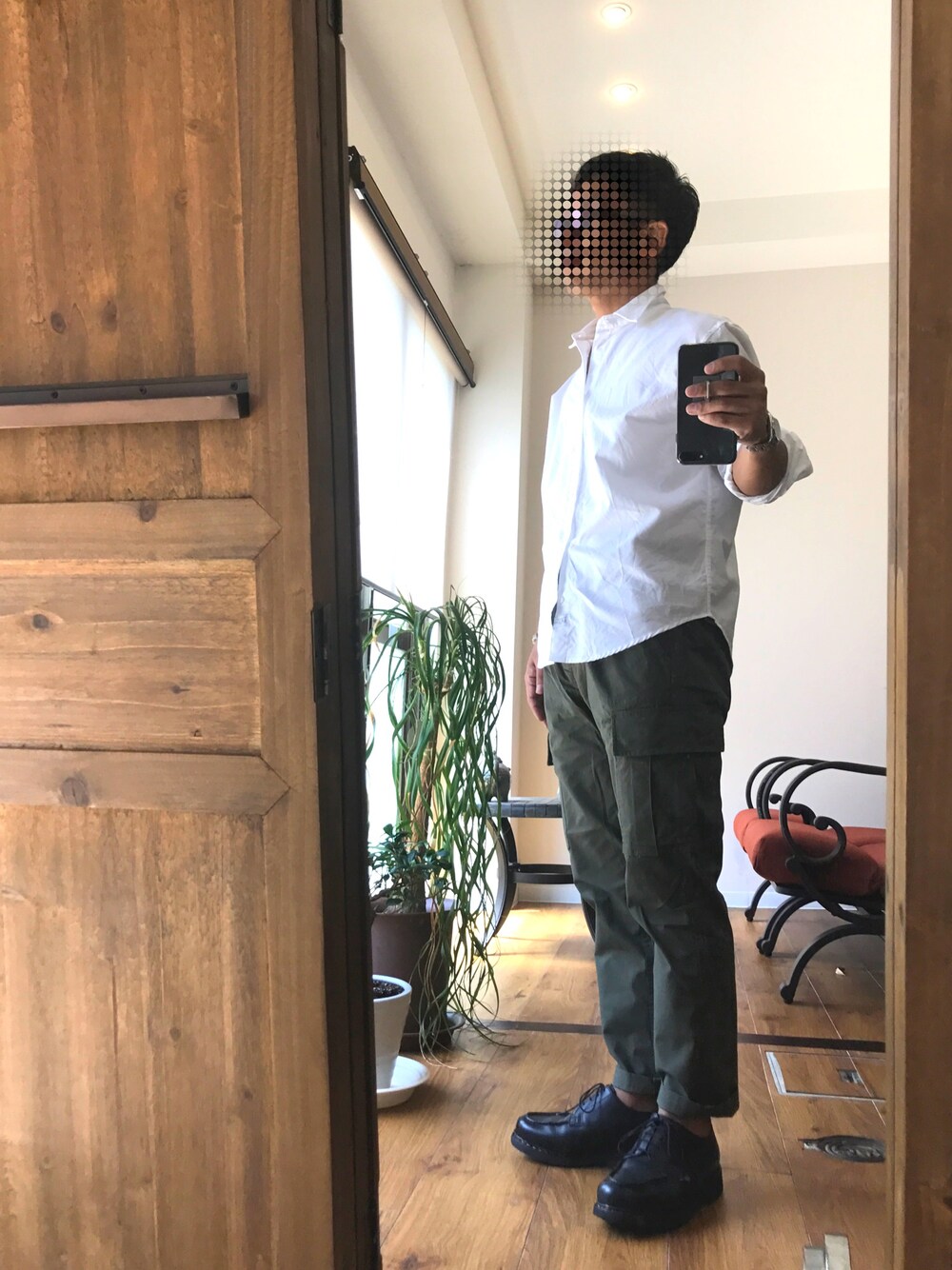 ド定番コーデ。 カーキのカーゴパンツに合うテッパントップスはやっぱり白シャツ。 サイズ感が大事。
