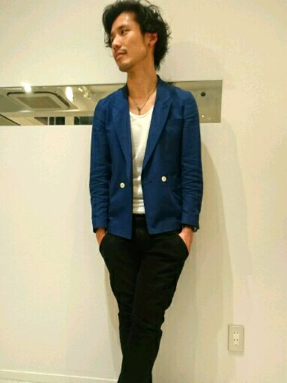 ブルー系のテーラードジャケットを着用したメンズの春コーディネートの1枚目の写真