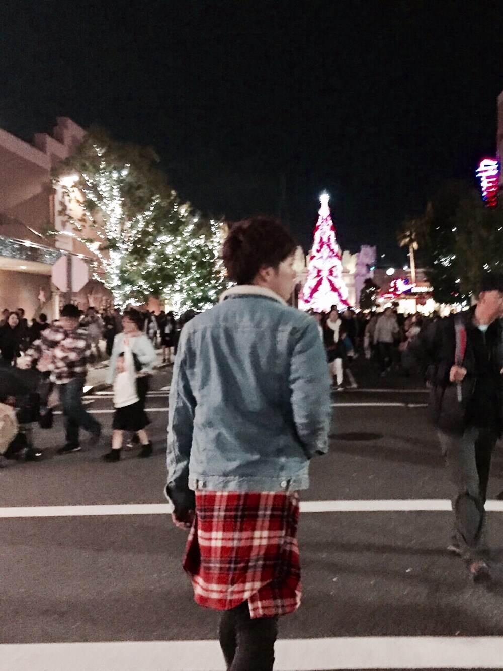 USJのツリーをバックに🌲 モアテン写ってないのが残念… 11月でもデニムのボアジャケットがあれば寒くなかった👍