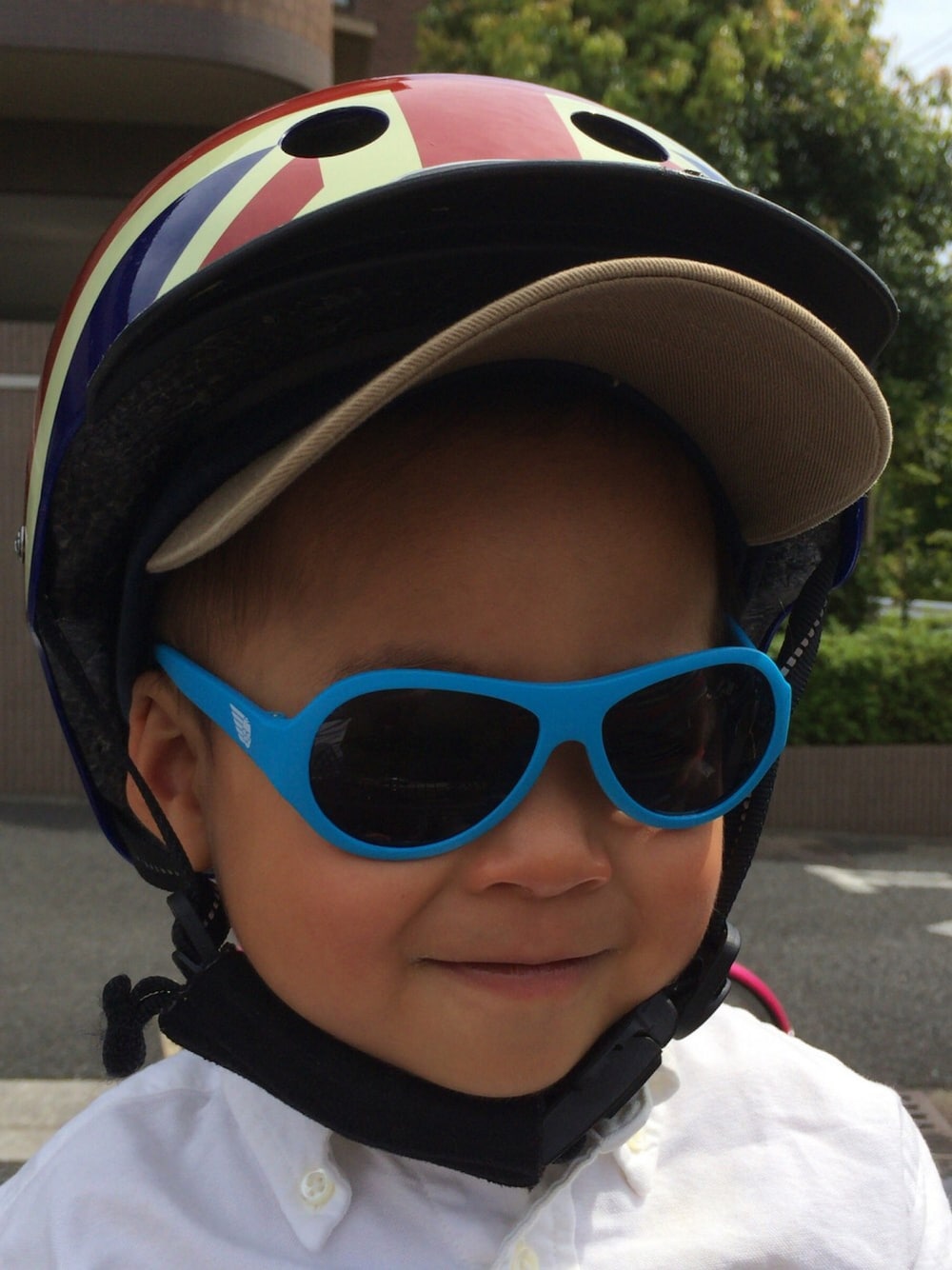 アメリカで購入したサングラスがお気に入り。Nutcaseのユニオンジャックメットを被って登園。