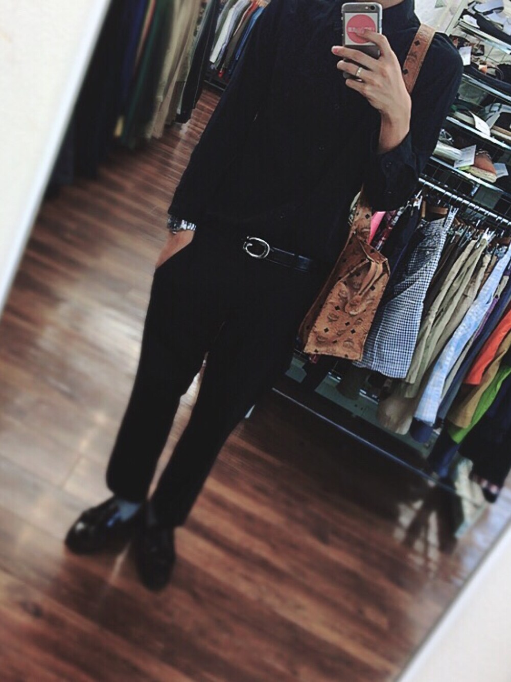 古着屋さんに行った時の格好です 最近は自分の系統が定まらなくて困ってますが、いろんな系統着るのもいいことだなって思って色々試してます。でも系統絞らないとお金の消費もひどいので絞りたいですね、poloのシャツをスラックスにタックインしてます。あとお気に入りのMCMのトートバッグ