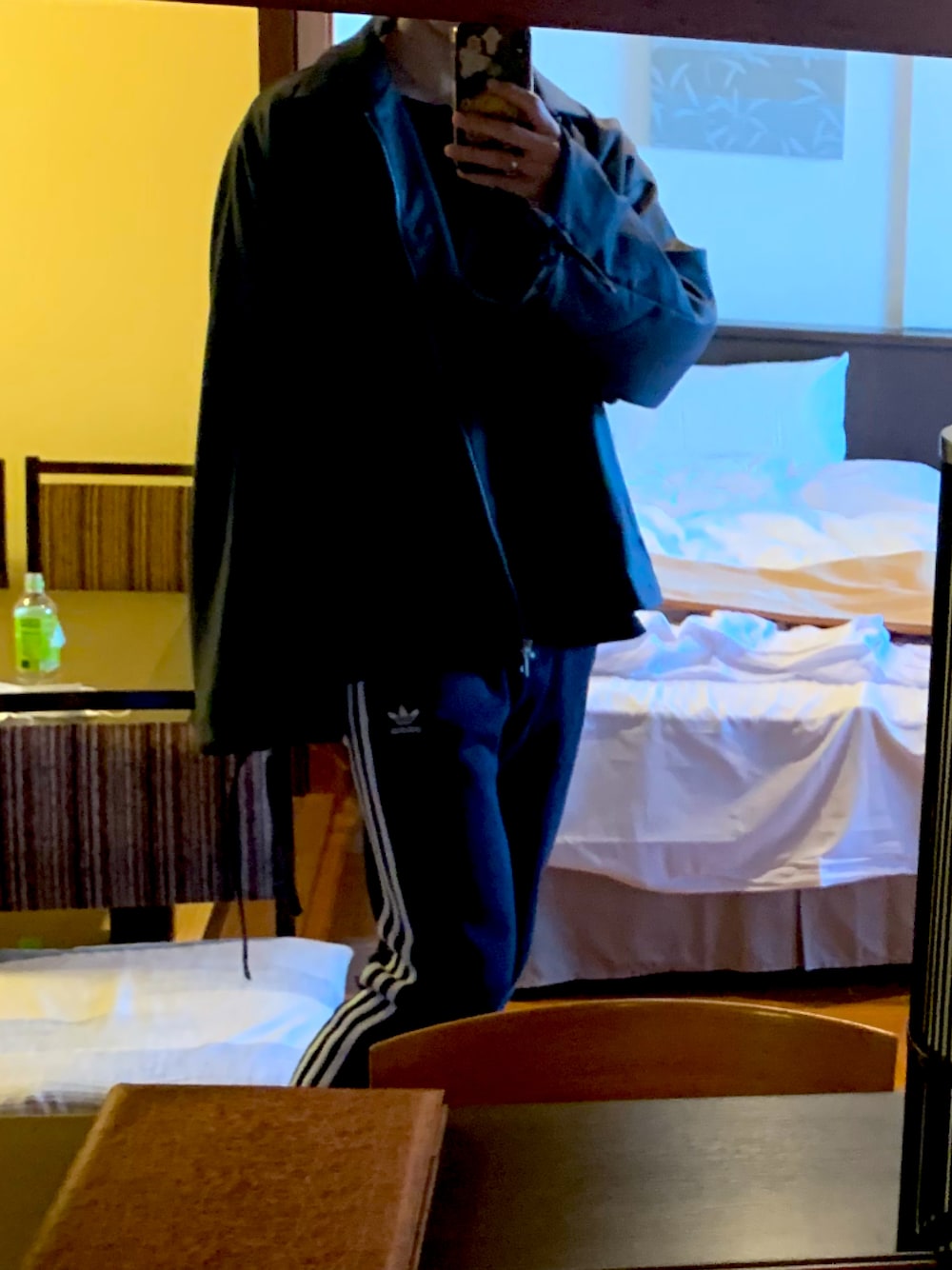 旅行中のスポーツミックスコーデ オーバサイズのアウターとアディパンでラフなコーデに *コーデの解説* ブルゾンもパンツもカジュアルなので黒でまとめました。 黒だけだと地味なのでアクセサリーを足すのがポイントです!