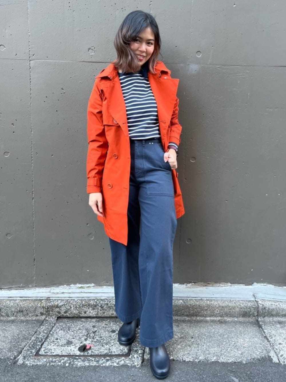 程よい光沢のある素材が春に映えるトレンチコート。カジュアルから綺麗めまでコーデで変化させることができるトレンチコートは、季節の変わり目に大活躍。今年らしいビビッドカラーで華やかさをプラス! 【スタッフ着用サイズ】 ・トレンチ:38 ・ロンT:M ・パンツ:36 ・ラバーブーツ:38 (24 cm)
