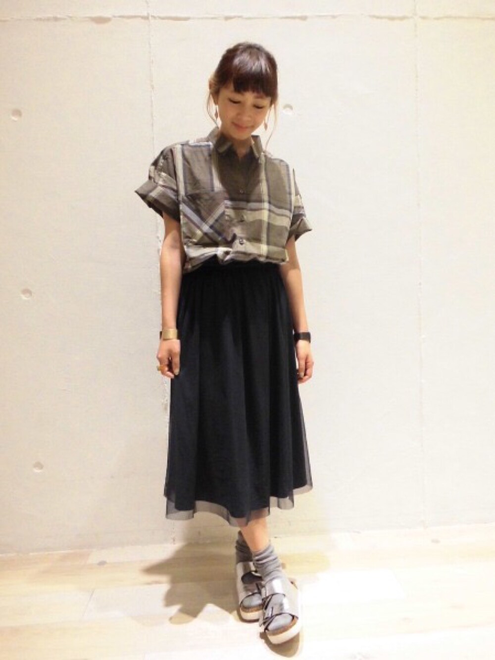 あまくなりやすいチュールスカートですが、落ち感があるので広がりを抑えて履くことができます。チェックシャツやTシャツなどカジュアルカットソーと合わせるのがオススメです!