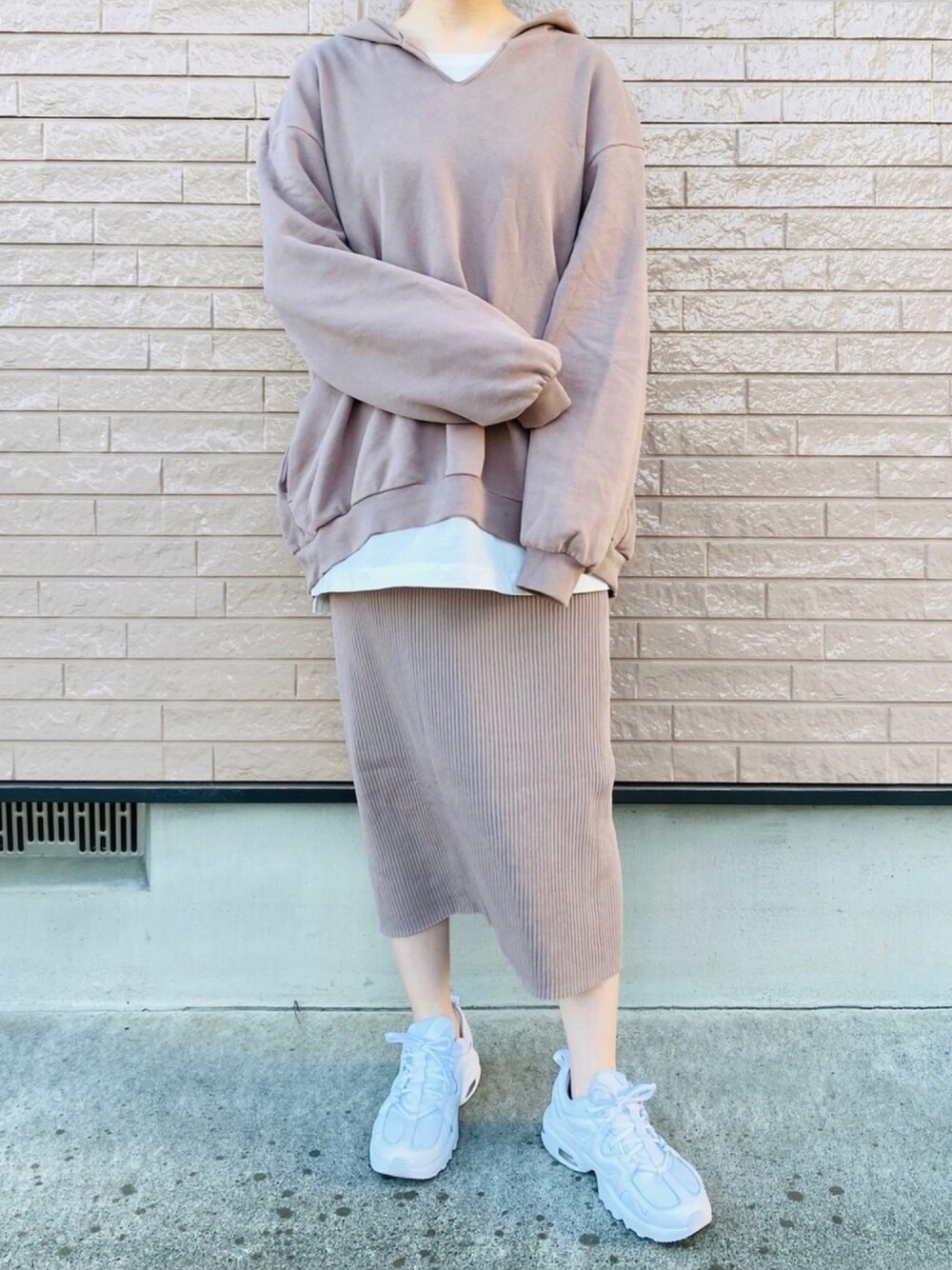 おうちコーデ。 肌触りの良いパーカーは、ワンサイズ上げてオーバーに。タイトスカートは、すっごく伸縮性があるから楽過ぎて重宝してる! 色味が似ているから、セットアップ風に◎