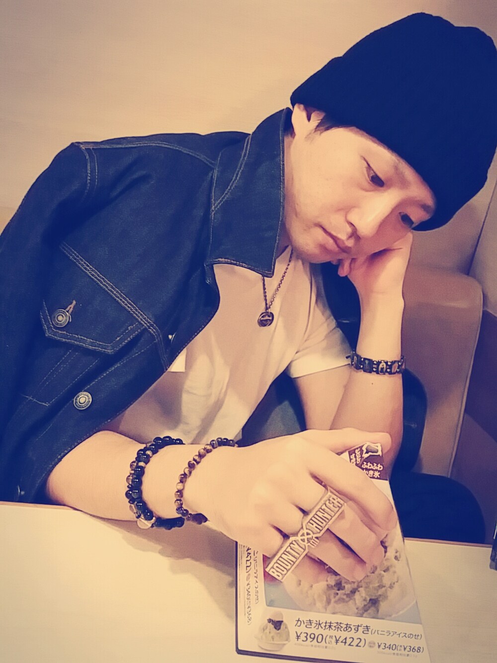 ホワイト系のTシャツ/カットソー、シルバー系のネックレス、ブルー系のニットキャップ/ビーニーを着用したメンズの秋コーディネートの1枚目の写真