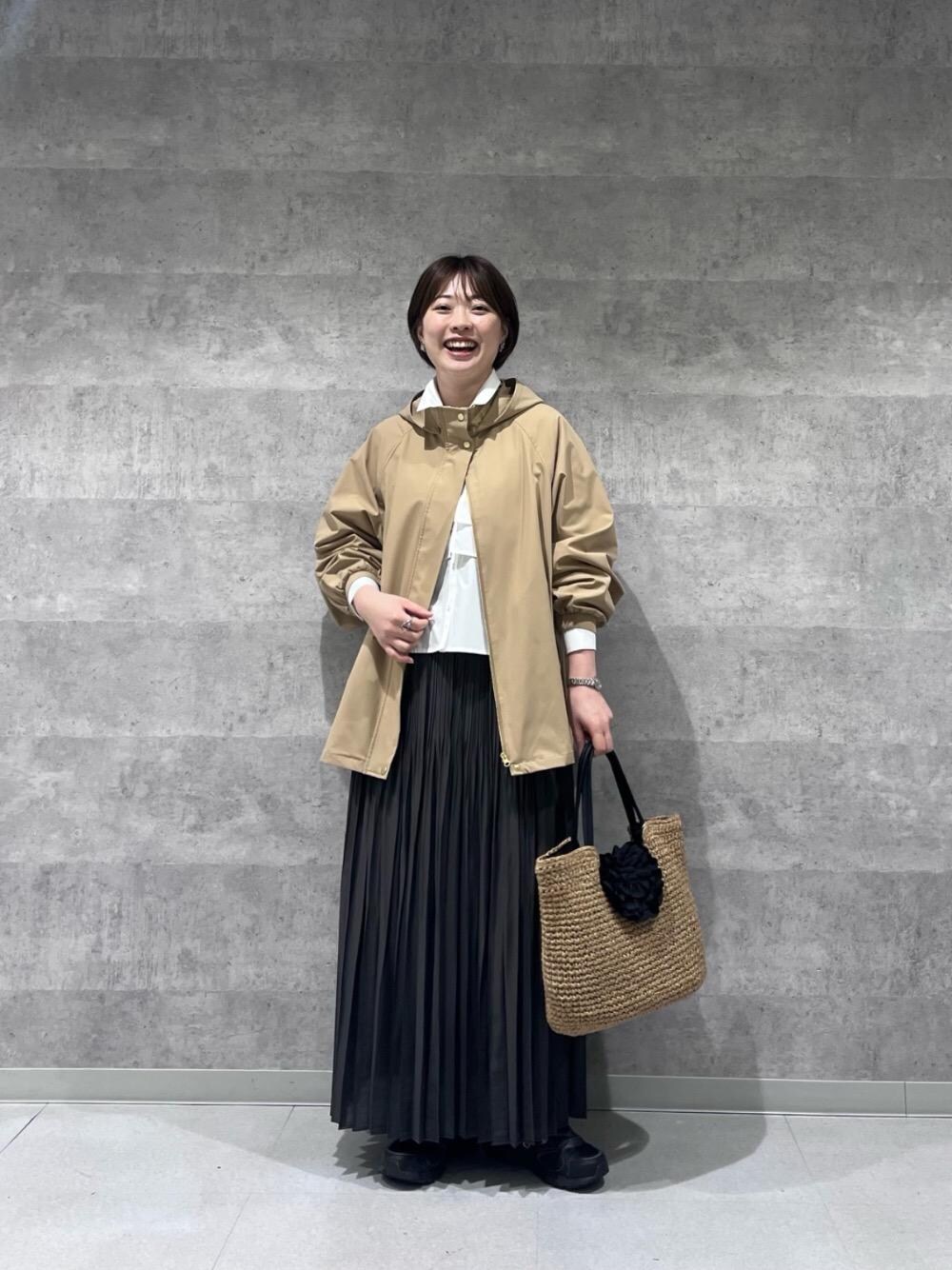 30代前半/157cm/骨格ウェーブ/普段サイズM/着用サイズ38 【サーブルクロスフードブルゾン】 サイズ感:ゆったりめ。ヒップも隠れます。ボリュームスリーブとのバランスもかわいいです 素材感:ハリがあり軽くてマットな質感です。シワになりにくく、持ち運びにもかさばりません◎ 着用感:驚くほど軽いです!比翼があることでバックスタイルにも立体感があり、深めのスリットが抜け感も演出。羽織るだけで大人カジュアルなスタイルが完成します 【ティアードフリルシャツ】 サイズ感:ボディラインを気にせず着られるゆったりめ。丈は短めです 素材感:ハリのある素材。ポリエステル混で、シワになりにくいです 着用感:胸元のフリルが1枚で華やかにクラスアップしてくれます。ウエストインしなくても、トレンド感のあるバランスになるのも嬉しいポイント 【麻混シアーランダムプリーツスカート】 サイズ感 : 総ゴムでリラックス感のある着心地。マキシ丈ですが、フラットシューズでも◎ 素材感 : やや裾にシアー感のある麻混素材。腰回りをすっきり見せるため、腰回りは細めのプリーツにしています 着用感 : さらっと軽い素材で、プリーツがすっきりとスタイルアップしてくれます。
