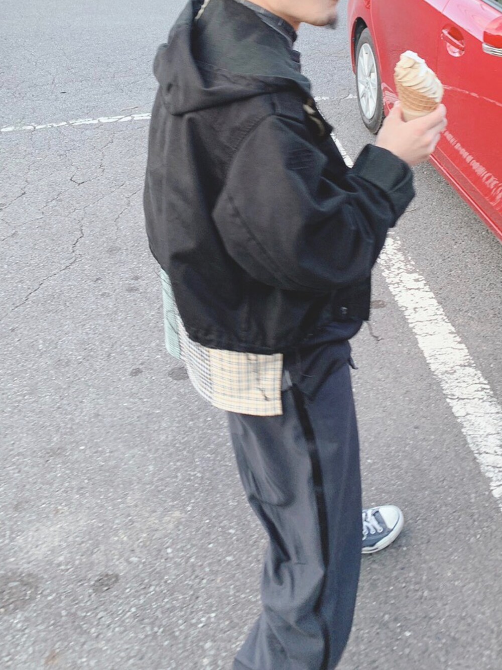 全身古着の日でした。 カットオフしたショート丈のドイツ軍のジャケットがお気に入り。 背面に柄のあるトップスを少しチラつかせたり、しなかったり。 ♪ くるり 「ばらの花」