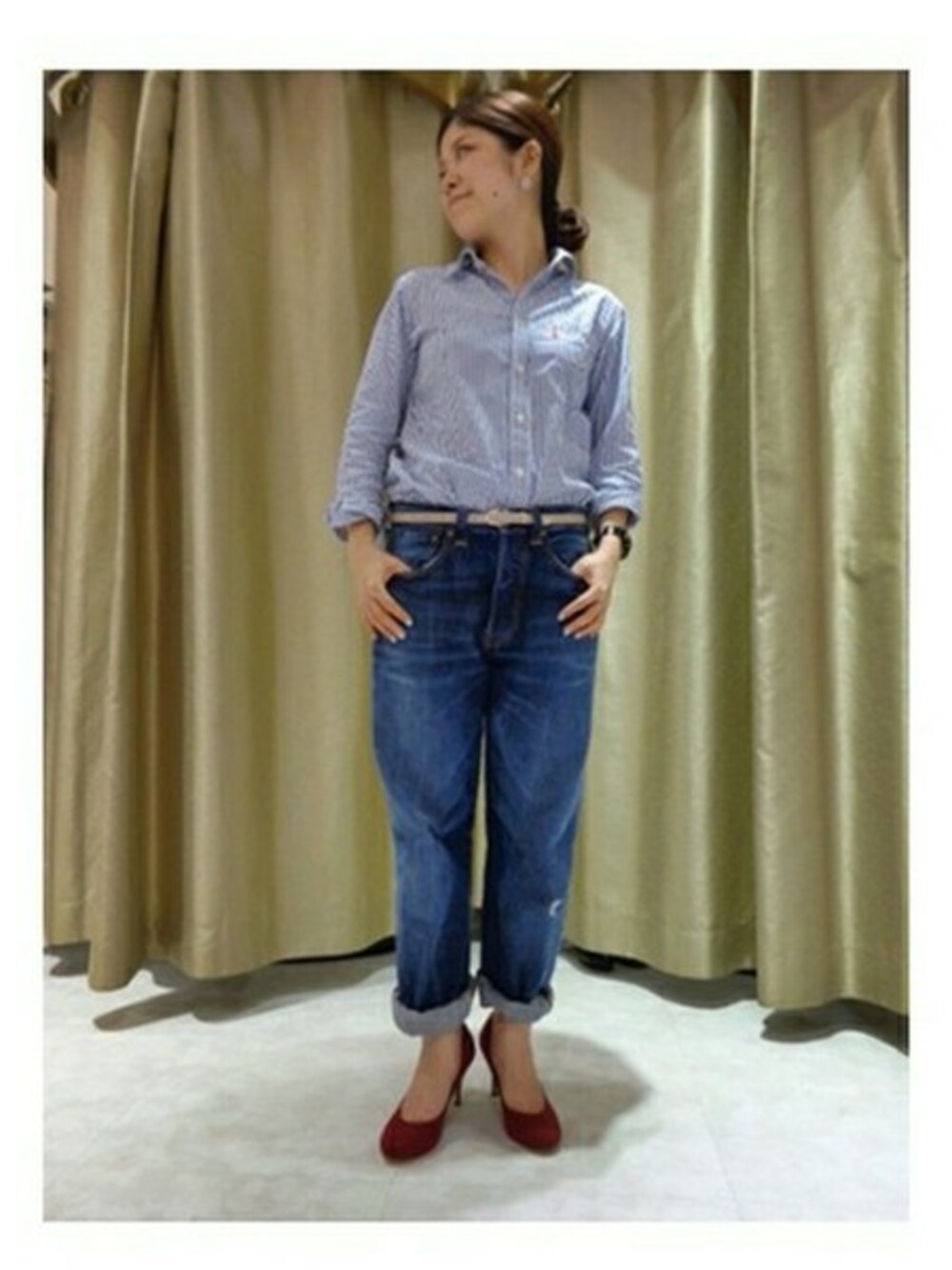 シンプルなデニムスタイルに、秋を感じさせる深みのあるレッドのパンプスが映えます♪ ルタロン定番の7.5cmスエードプレーンパンプスは、ただ今ご予約会を開催していますので、ぜひご覧ください!