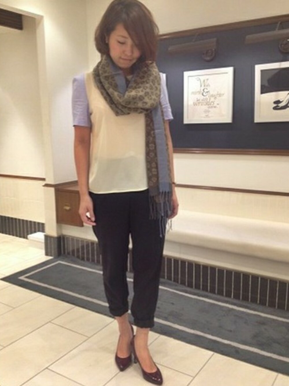 今年マストのポインテッドトウパンプスは、深みのあるボルドーカラーが素足にも映えます。 パンツスタイルも女性らしい足元に。