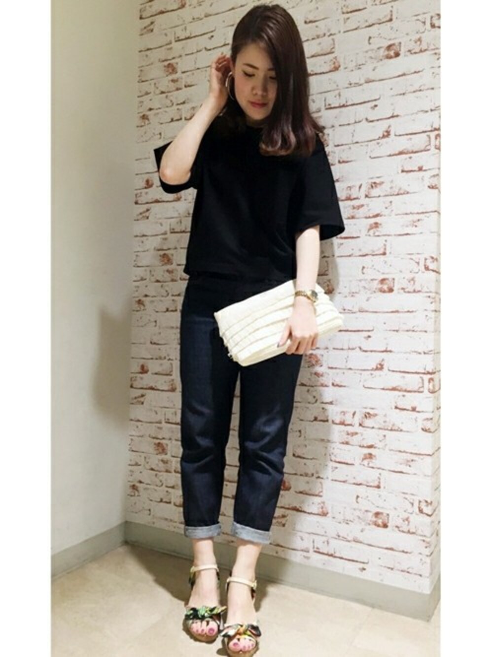 カラフルなサンダルはシンプルコーデのポイントにおすすめ! 大人っぽく持てるBERTINIのクラッチバッグはさりげない存在感が◎