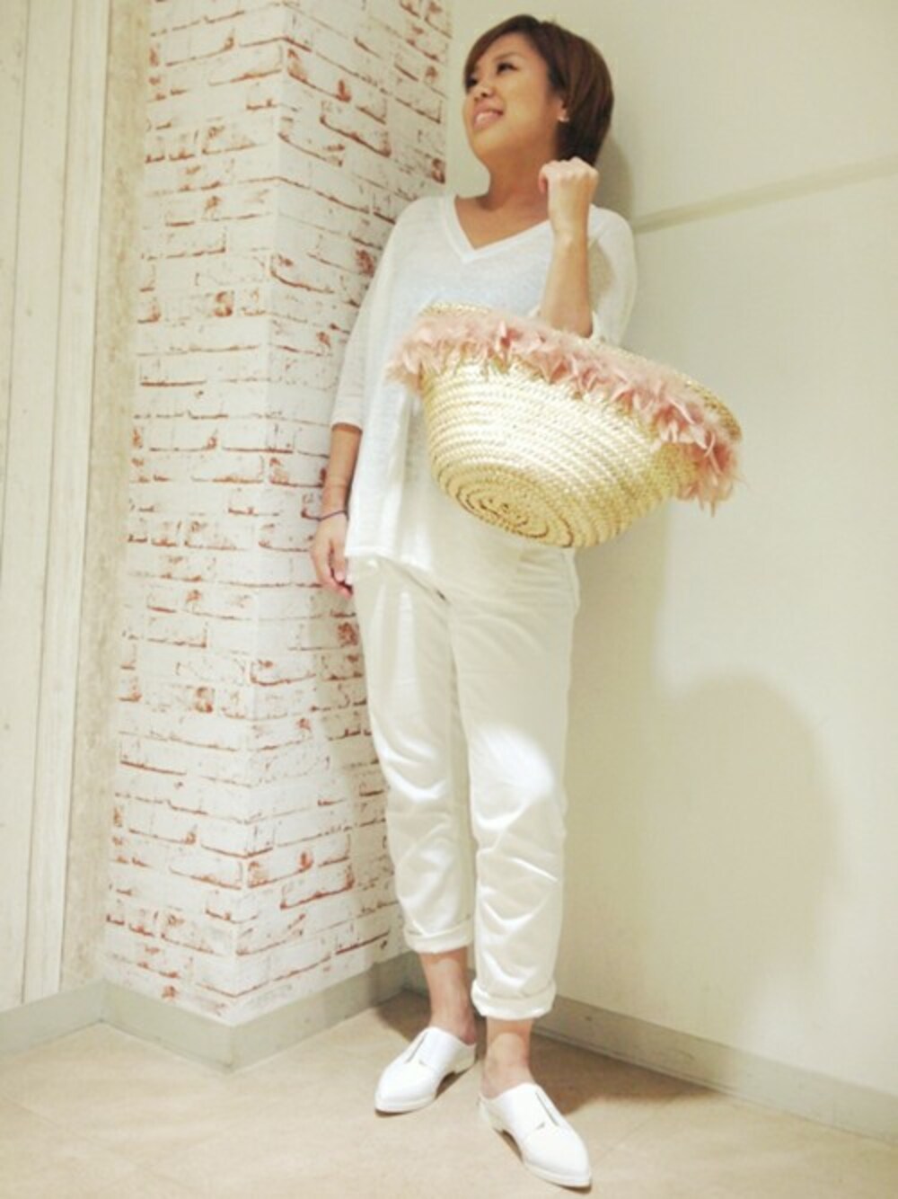オール白のコーデにメンズライクなミュールが存在感を発揮します。