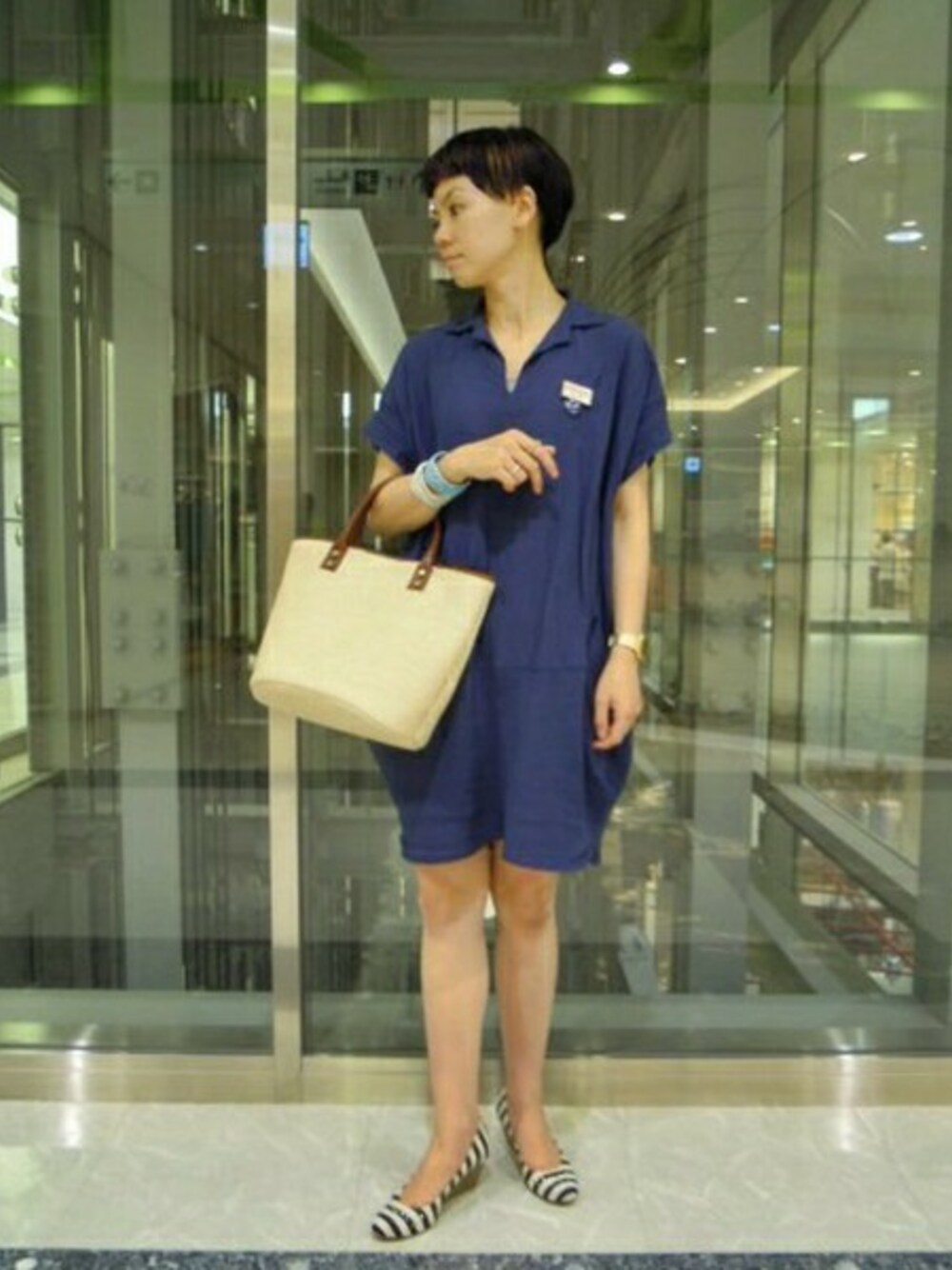 ボーダーのウエッジソールパンプスでマリン風コーデに♪ カゴバッグは、レザーの持ち手がポイントのおすすめアイテムです!