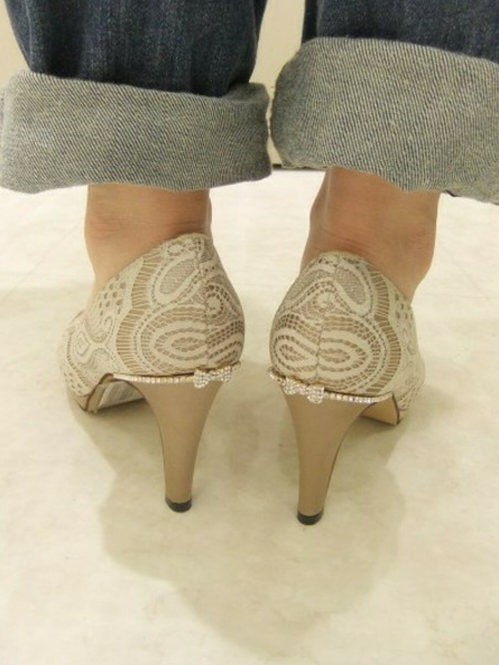 バックスタイルまで気を抜かない、キラキラのラインストーンリボンがポイントのパンプス。 春らしいレース使いがフェミニンコーデ派に大人気です! パーティーシーンにもおすすめ♪