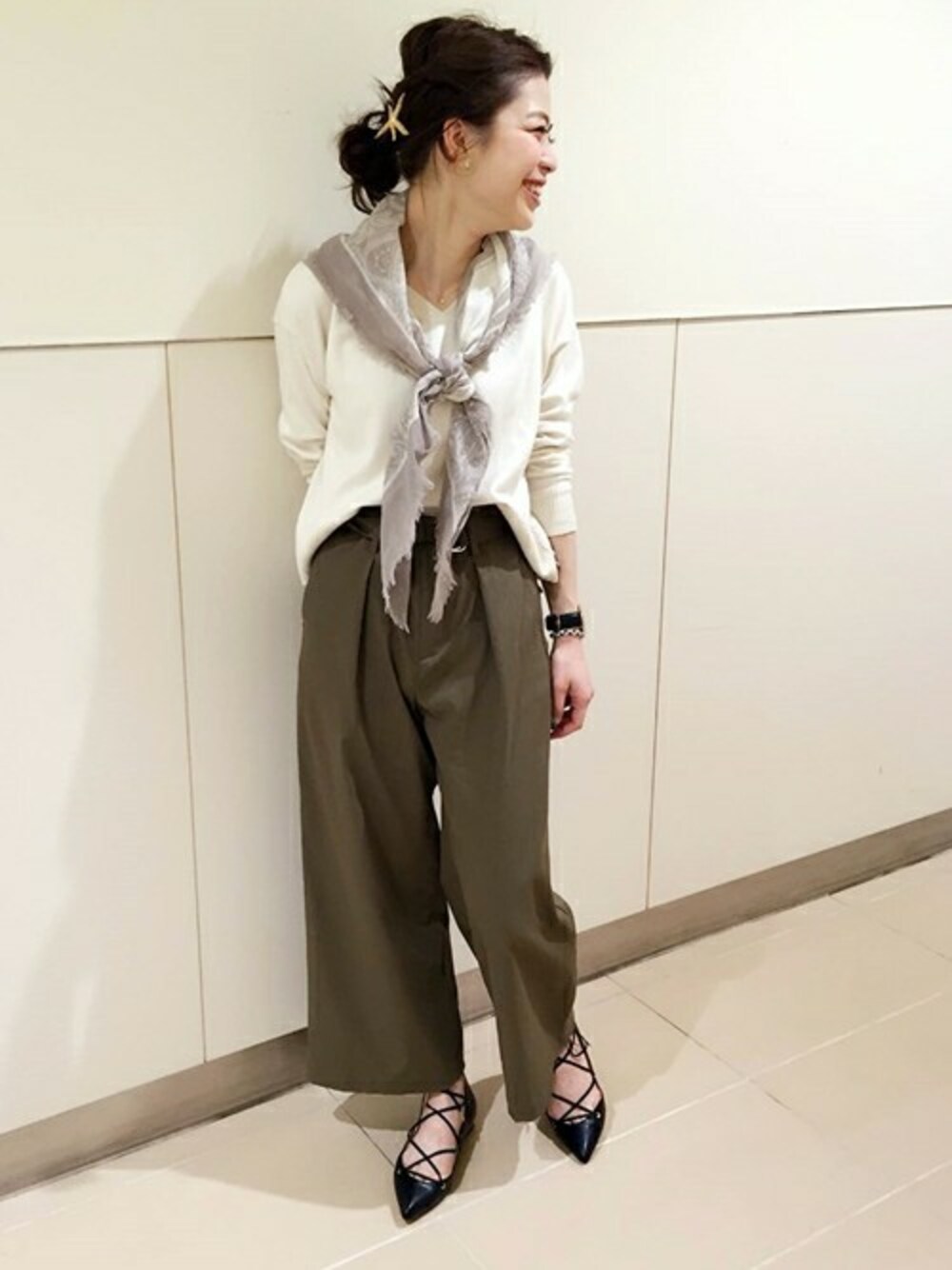 大人気のレースアップシューズは、ワイドパンツからちらりとのぞかせて大人な足元に。 春らしいトーンのコーデを引き締めてくれるブラックは万能カラーですね!