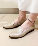 こんにちは! 今日はプライスダウンアイテムからおすすめのご紹介です。 無地に見えて小さな☆のパンチングデザインが可愛いこちら! 足元を華やかに見せるゴールドのカラーが夏の足元にぴったりのオペラシューズです。 ホワイトのボトムなど明るいカラーに相性が良いので、これから大活躍しそうですよね! 楽ちんな履き心地なので、通勤や夏のレジャーシーンにもぴったりですよ。