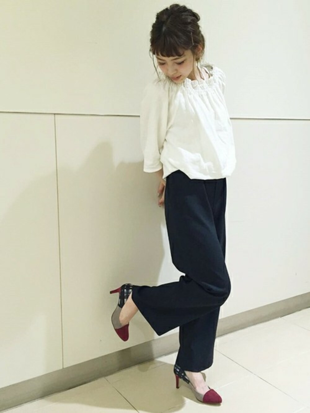 トレンドカラーのボルドーの配色に注目。 秋に向けて1番に欲しくなる、おすすめのパンプスです! まずはモノトーンコーデに合わせて存在感を楽しんで♪