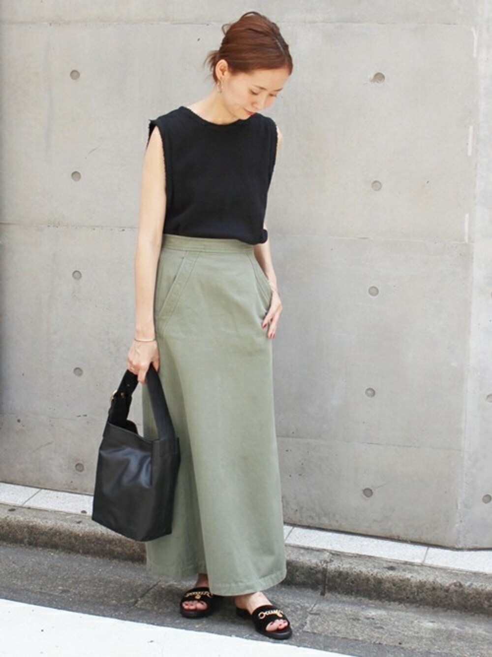 トレンドのベルベット素材を気軽に楽しめるミュールは、秋を待たずにスタイリングにすぐ取り入れられます。 女性らしいシルエットのロングスカートに合わせてハズしに。