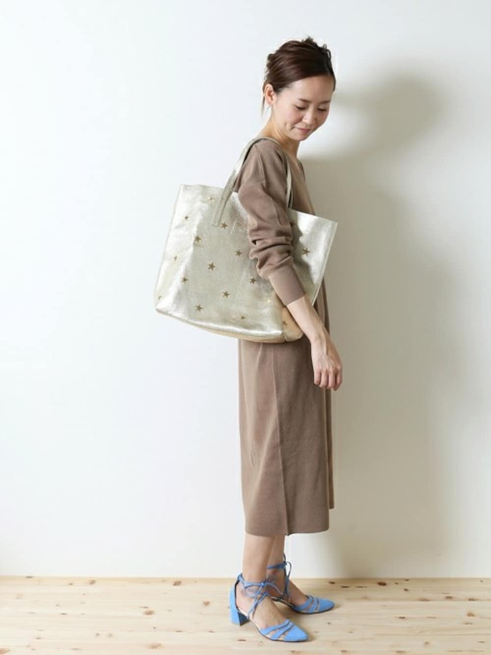 ゴールドカラーが目を引くトートバッグは、ナチュラルなベージュのニットワンピースに合わせて大人っぽく。